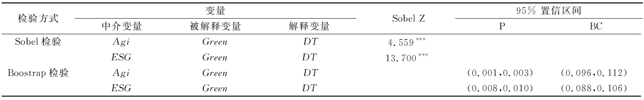 检验方式变量中介变量被解释变量解释变量Sobel Z95% 置信区间PBCSobel检验AgiGreenDT4.559***ESGGreenDT13.700***Boostrap检验AgiGreenDT(0.001,0.003)(0.096,0.112)ESGGreenDT(0.008,0.010)(0.088,0.106)