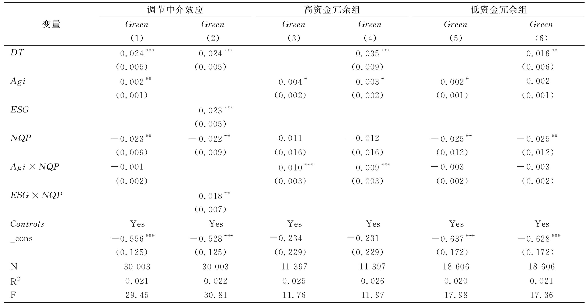 变量调节中介效应GreenGreen(1)(2)高资金冗余组GreenGreen(3)(4)低资金冗余组GreenGreen(5)(6)DT0.024***0.024***0.035***0.016**(0.005)(0.005)(0.009)(0.006)Agi0.002**0.004*0.003*0.002*0.002(0.001)(0.002)(0.002)(0.001)(0.001)ESG0.023***(0.005)NQP-0.023**-0.022**-0.011-0.012-0.025**-0.025**(0.009)(0.009)(0.016)(0.016)(0.012)(0.012)Agi×NQP-0.0010.010***0.009***-0.003-0.003(0.002)(0.003)(0.003)(0.002)(0.002)ESG×NQP0.018**(0.007)ControlsYesYesYesYesYesYes_cons-0.556***-0.528***-0.234-0.231-0.637***-0.628***(0.125)(0.125)(0.229)(0.229)(0.172)(0.172)N30 00330 00311 39711 39718 60618 606R20.0210.0220.0250.0260.0200.021F29.4530.8111.7611.9717.9817.36