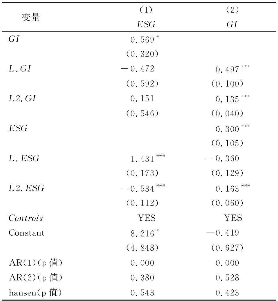 本文采用动态面板数据系统GMM估计法确定变量的滞后项。在动态模型中,在解释变量滞后两期的条件下即可满足信息的完整表达[22]。OLS回归结果显示,GIn-1、GIn-2分别与GI显著相关,ESGn-1、ESGn-2分别与ESG显著相关。这意味着滞后两期绿色创新行为和ESG责任履行可充分完整反映出模型的动态性。构建以下存在滞后项的动态模型以检验两者之间的交互跨期作用(M1和M2)。