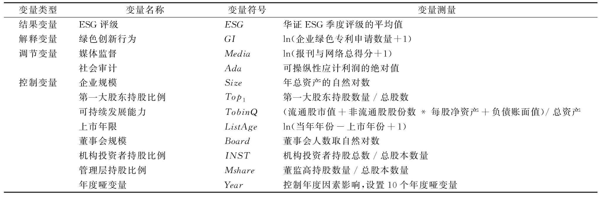基于相关文献,本文控制以下变量:①企业规模(Size):企业规模与媒体舆论关注成正比,社会更加关注大规模企业绿色创新行为和ESG责任履行情况;②第一大股东持股比例(Top1):企业长期战略与短期战术决策均受大股东影响;③可持续发展能力(TobinQ):企业发展能力不同,市场对未来收益的预期也不同,进而影响企业投融资决策和绿色创新战略;④上市年限(ListAge):上市年限不同的企业,其竞争和创新能力存在差异。此外,本文控制了董事会规模(Board)、机构投资者持股比例(INST)管理层持股比例(Mshare)等可能影响绿色创新的因素。所有变量定义与测量见表1。
