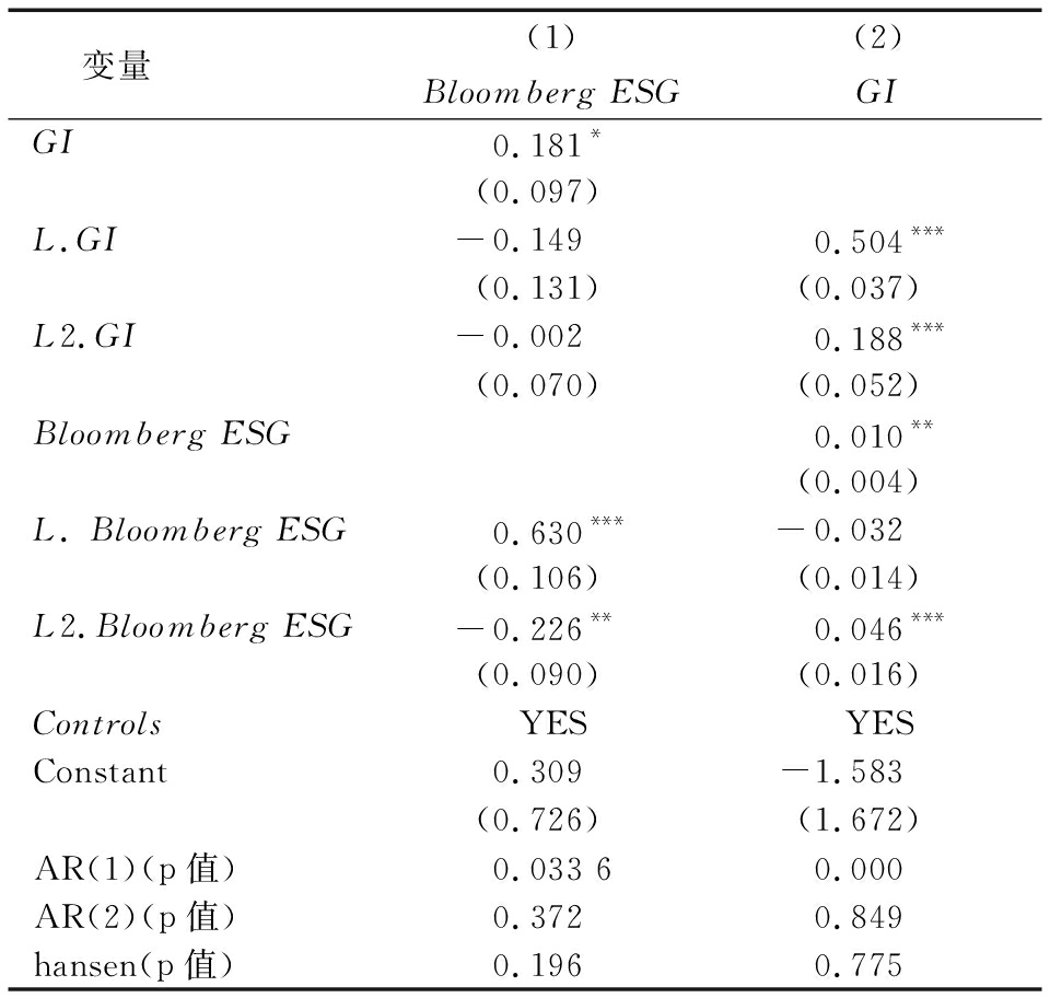 上述检验结果未发生实质变化,说明假设检验结果稳健。表5列(1)结果显示,GI系数为0.181且在10%水平上显著,进一步证实H1。表5列(2)结果显示,Bloomberg ESG系数为0.010且在5%水平上显著,L2.Bloomberg ESG系数为0.046且在1%水平上显著,进一步证实假设H2。