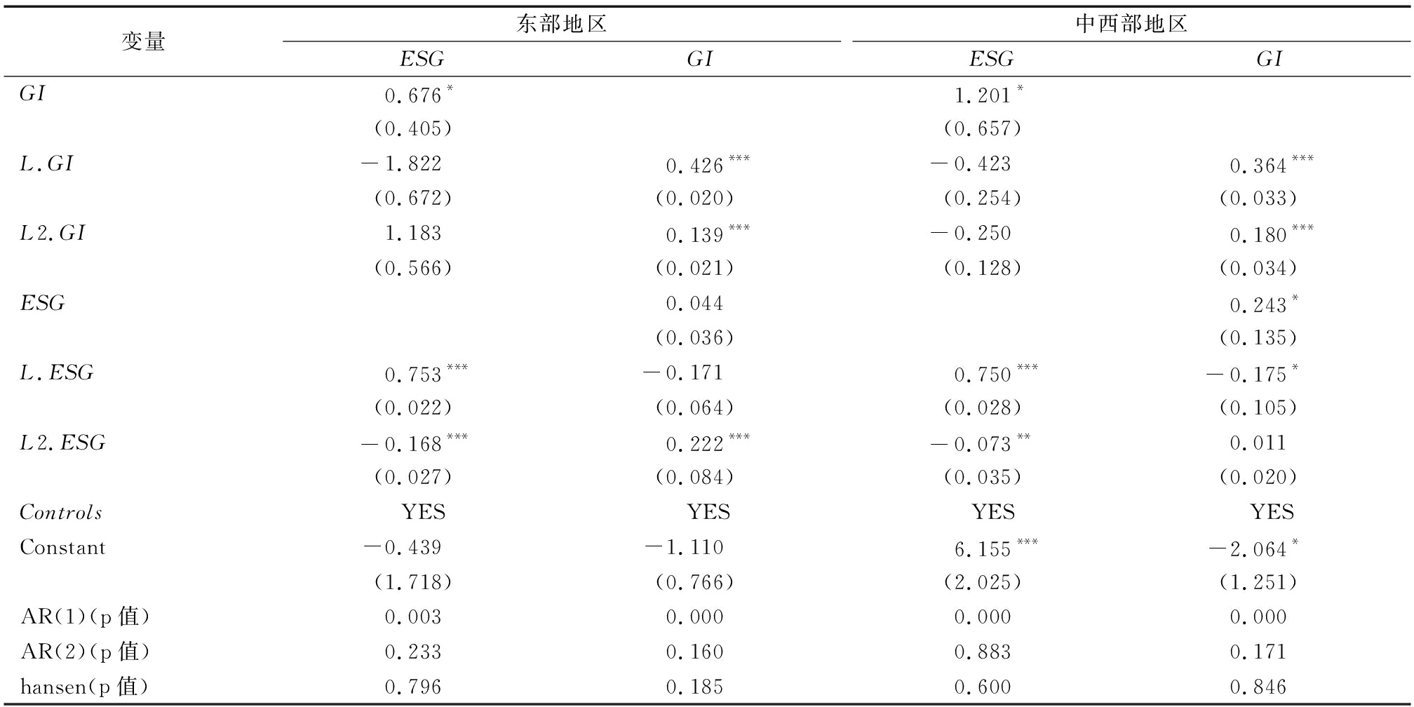 变量东部地区ESGGI中西部地区ESGGIGI0.676*1.201*(0.405)(0.657)L.GI-1.8220.426***-0.4230.364***(0.672)(0.020)(0.254)(0.033)L2.GI1.1830.139***-0.2500.180***(0.566)(0.021)(0.128)(0.034)ESG0.0440.243*(0.036)(0.135)L.ESG0.753***-0.1710.750***-0.175*(0.022)(0.064)(0.028)(0.105)L2.ESG-0.168***0.222***-0.073**0.011(0.027)(0.084)(0.035)(0.020)ControlsYESYESYESYESConstant-0.439-1.1106.155***-2.064*(1.718)(0.766)(2.025)(1.251)AR(1)(p值)0.0030.0000.0000.000AR(2)(p值)0.2330.1600.8830.171hansen(p值)0.7960.1850.6000.846