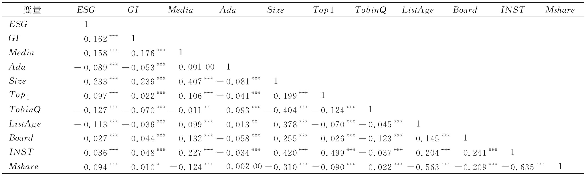 变量ESGGIMediaAdaSizeTop1TobinQListAgeBoardINSTMshareESG1GI0.162***1Media0.158***0.176***1Ada-0.089***-0.053***0.001 001Size0.233***0.239***0.407***-0.081***1Top10.097***0.022***0.106***-0.041***0.199***1TobinQ-0.127***-0.070***-0.011**0.093***-0.404***-0.124***1ListAge-0.113***-0.036***0.099***0.013**0.378***-0.070***-0.045***1Board0.027***0.044***0.132***-0.058***0.255***0.026***-0.123***0.145***1INST0.086***0.048***0.227***-0.034***0.420***0.499***-0.037***0.204***0.241***1Mshare0.094***0.010*-0.124***0.002 00-0.310***-0.090***0.022***-0.563***-0.209***-0.635***1