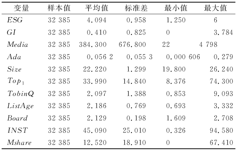 变量样本值平均值标准差最小值最大值ESG32 3854.0940.9581.2506GI32 3850.4100.82503.784Media32 385384.300676.800224 798Ada32 3850.056 20.055 30.000 6060.279Size32 38522.2201.29919.80026.240Top132 38533.99014.8408.37674.300TobinQ32 3852.0971.3880.8539.093ListAge32 3852.1860.7690.6933.332Board32 3852.1290.1981.6092.708INST32 38545.09025.0100.32694.580Mshare32 38512.52018.910067.410