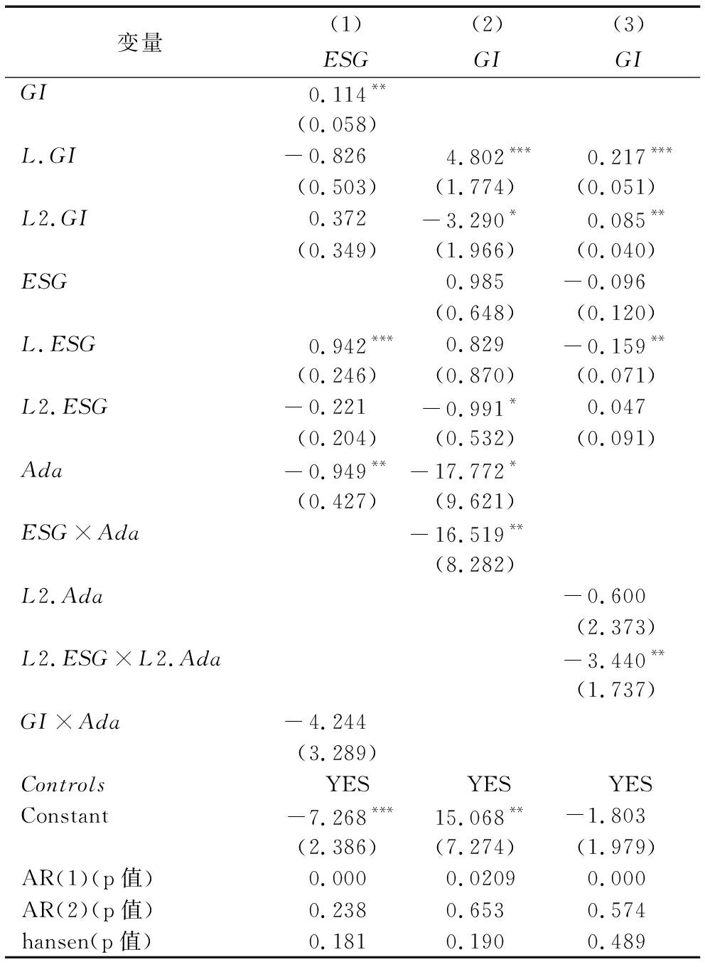 变量(1)(2)(3)ESGGIGIGI0.114**(0.058)L.GI-0.8264.802***0.217***(0.503)(1.774)(0.051)L2.GI0.372-3.290*0.085**(0.349)(1.966)(0.040)ESG0.985-0.096(0.648)(0.120)L.ESG0.942***0.829-0.159**(0.246)(0.870)(0.071)L2.ESG-0.221-0.991*0.047(0.204)(0.532)(0.091)Ada-0.949**-17.772*(0.427)(9.621)ESG×Ada-16.519**(8.282)L2.Ada-0.600(2.373)L2.ESG×L2.Ada-3.440**(1.737)GI×Ada-4.244(3.289)ControlsYESYESYESConstant-7.268***15.068**-1.803(2.386)(7.274)(1.979)AR(1)(p值)0.0000.02090.000AR(2)(p值)0.2380.6530.574hansen(p值)0.1810.1900.489