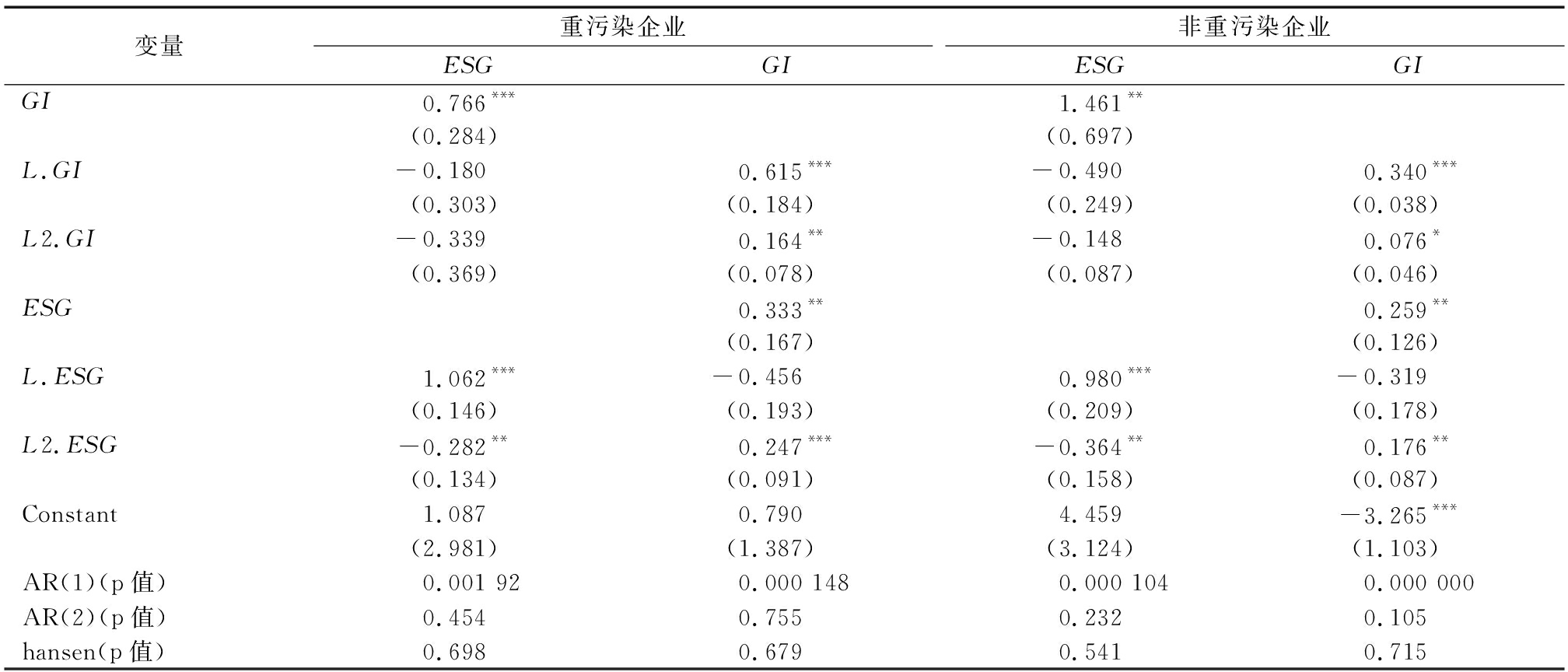 变量重污染企业ESGGI非重污染企业ESGGIGI0.766***1.461**(0.284)(0.697)L.GI-0.1800.615***-0.4900.340***(0.303)(0.184)(0.249)(0.038)L2.GI-0.3390.164**-0.1480.076*(0.369)(0.078)(0.087)(0.046)ESG0.333**0.259**(0.167)(0.126)L.ESG1.062***-0.4560.980***-0.319(0.146)(0.193)(0.209)(0.178)L2.ESG-0.282**0.247***-0.364**0.176**(0.134)(0.091)(0.158)(0.087)Constant1.0870.7904.459-3.265***(2.981)(1.387)(3.124)(1.103)AR(1)(p值)0.001 920.000 1480.000 1040.000 000AR(2)(p值)0.4540.7550.2320.105hansen(p值)0.6980.6790.5410.715