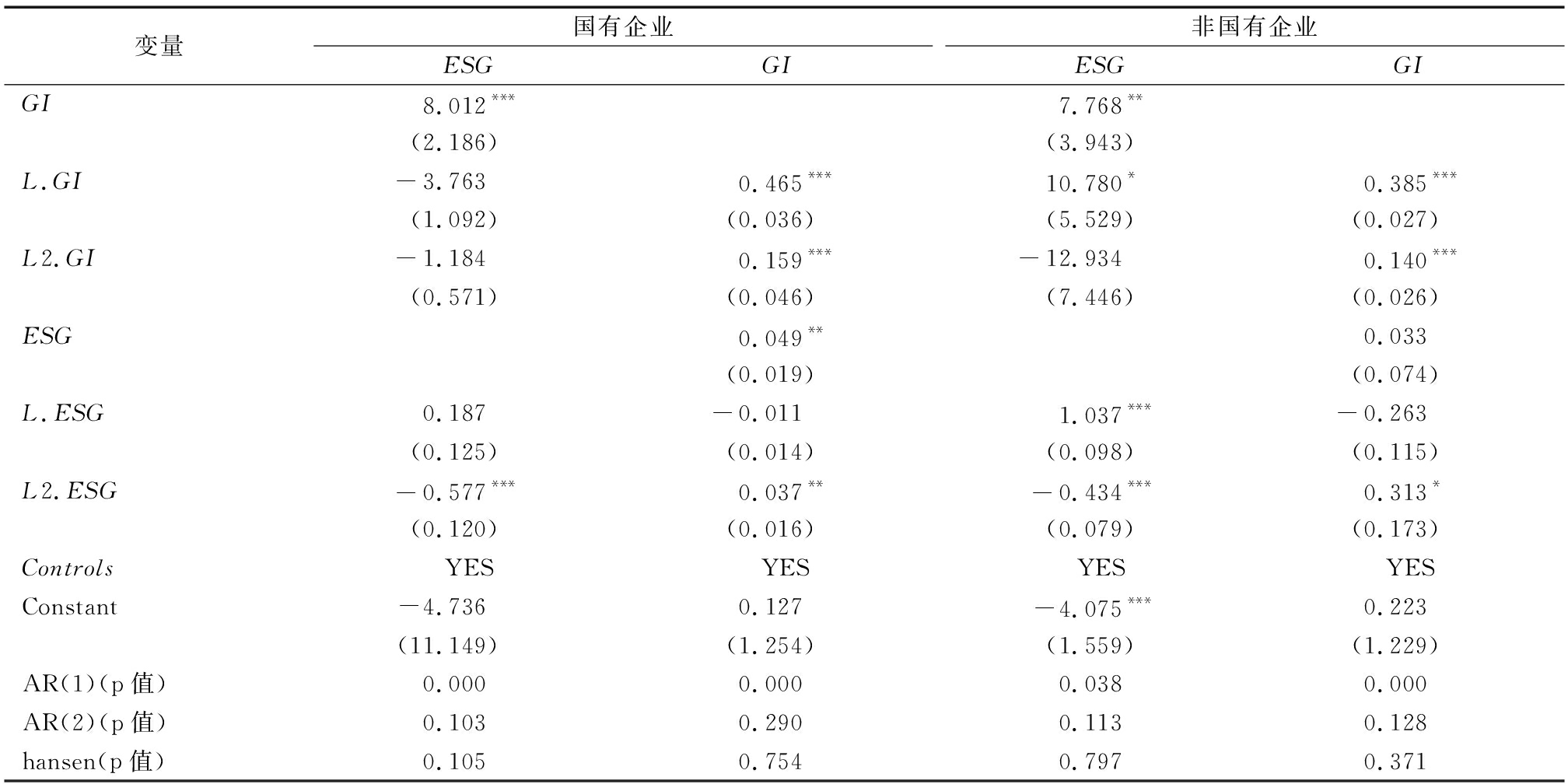 变量国有企业ESGGI非国有企业ESGGIGI8.012***7.768**(2.186)(3.943)L.GI-3.7630.465***10.780*0.385***(1.092)(0.036)(5.529)(0.027)L2.GI-1.1840.159***-12.9340.140***(0.571)(0.046)(7.446)(0.026)ESG0.049**0.033(0.019)(0.074)L.ESG0.187-0.0111.037***-0.263(0.125)(0.014)(0.098)(0.115)L2.ESG-0.577***0.037**-0.434***0.313*(0.120)(0.016)(0.079)(0.173)ControlsYESYESYESYESConstant-4.7360.127-4.075***0.223(11.149)(1.254)(1.559)(1.229)AR(1)(p值)0.0000.0000.0380.000AR(2)(p值)0.1030.2900.1130.128hansen(p值)0.1050.7540.7970.371