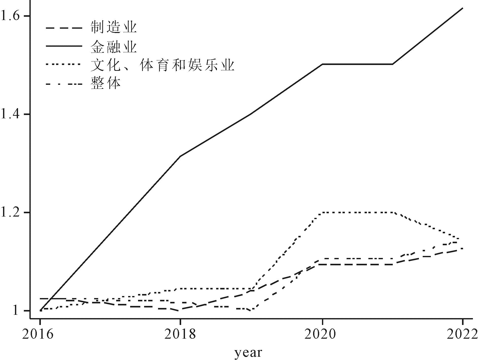 图1展现了2016-2022年制造业、金融业、文化、体育和娱乐业以及各年整体的市场准入管制放松程度,可以看出各行业市场准入管制的调整趋势并不一致,表明政府并非一味地放松市场准入管制,而是在不断探索适合各行业发展的市场准入管制范围。