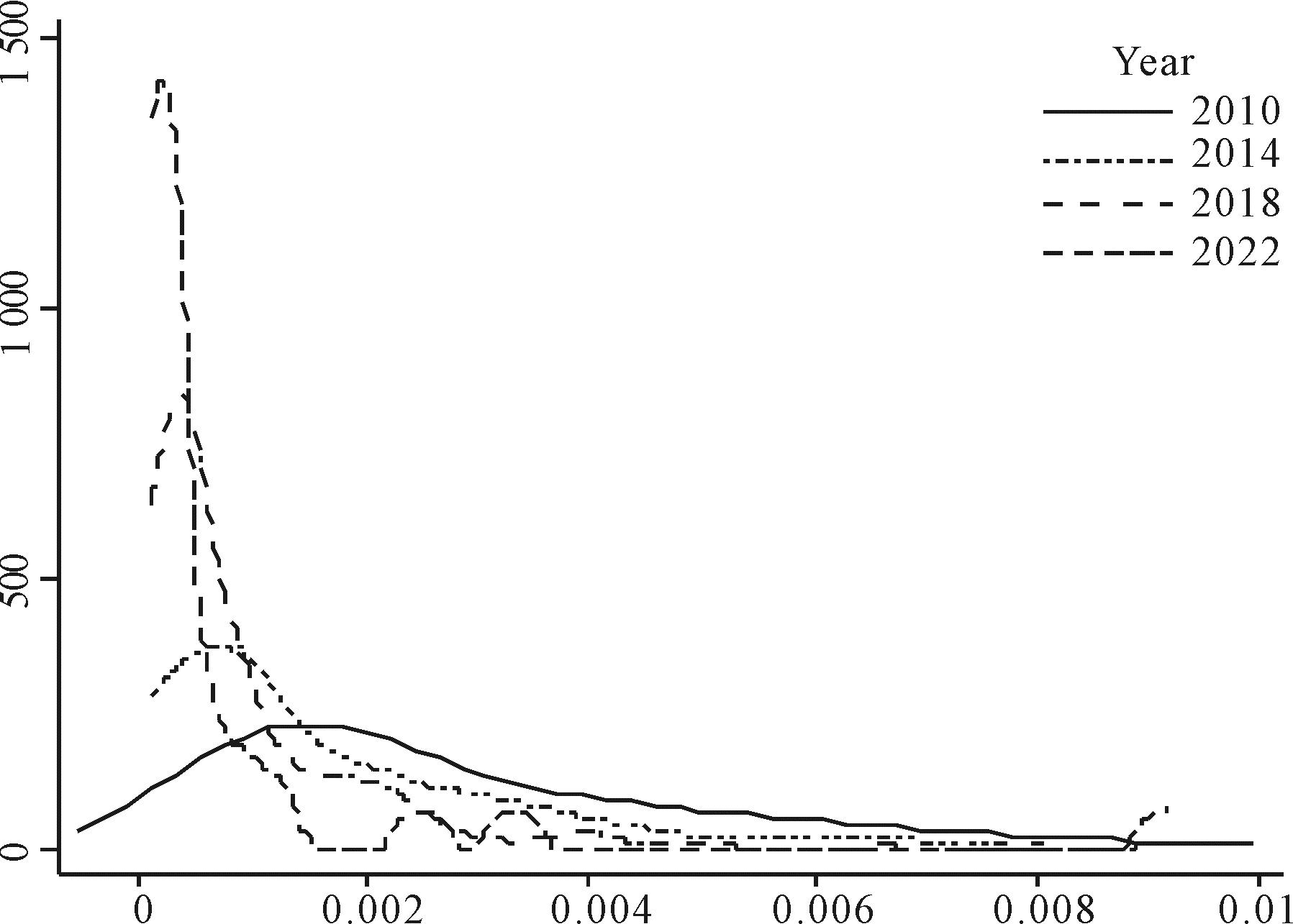 利用核密度图分析2010—2022年中国各地区行业平均本地化创新能力的时空特征。如图2所示,2010—2022年主峰位置不断向左移动,高度持续上升,同时,主峰宽度逐渐收窄,表明创新能力具有集中趋势。此外,核密度分布曲线均存在明显的右拖尾,表明各地区创新能力逐渐向平均水平靠拢,整体创新能力都有所提高并趋于收敛。综上可以看出,创新能力呈现出多极分化格局,同时,存在一定的空间扩散现象。图3为深圳市科学研究和技术服务业以及金融业的市场准入管制放松程度与本地化创新能力,可以发现,期初未实施市场负面清单制度时本地化行业创新能力变化并不明显,随着该行业市场准入管制的逐渐放松,本地化行业创新能力提升显著。