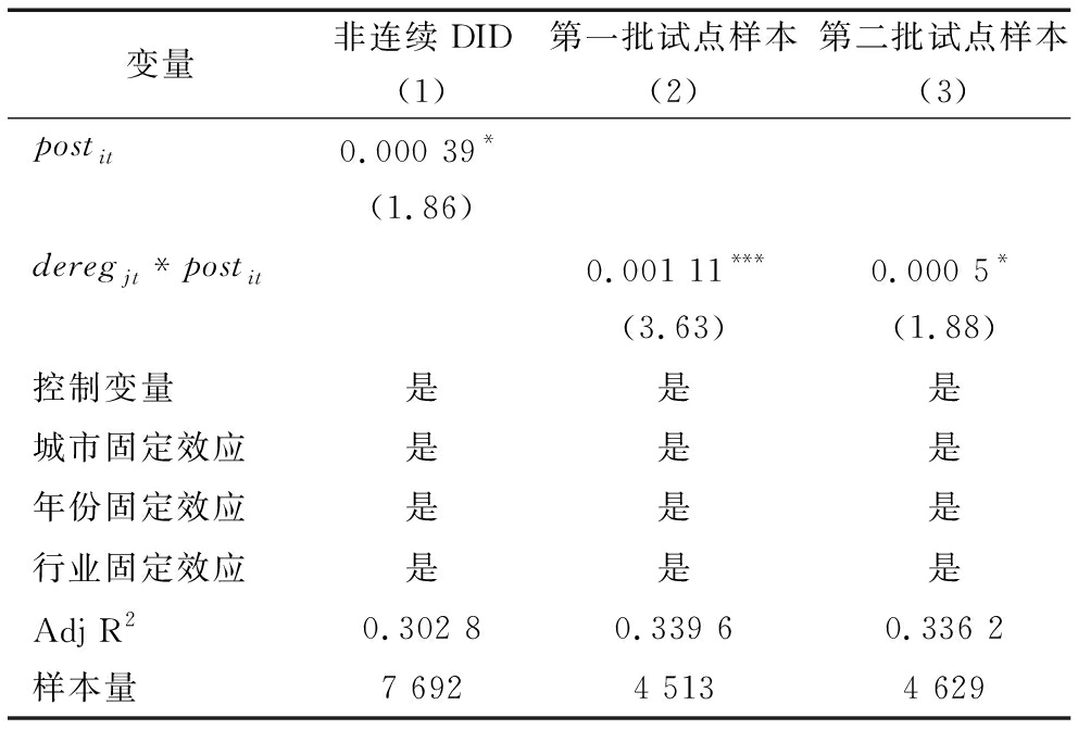 变量非连续DID第一批试点样本第二批试点样本(1)(2)(3)postit0.000 39*(1.86)deregjt*postit0.001 11***0.000 5*(3.63)(1.88)控制变量是是是城市固定效应是是是年份固定效应是是是行业固定效应是是是Adj R20.302 80.339 60.336 2样本量7 6924 5134 629