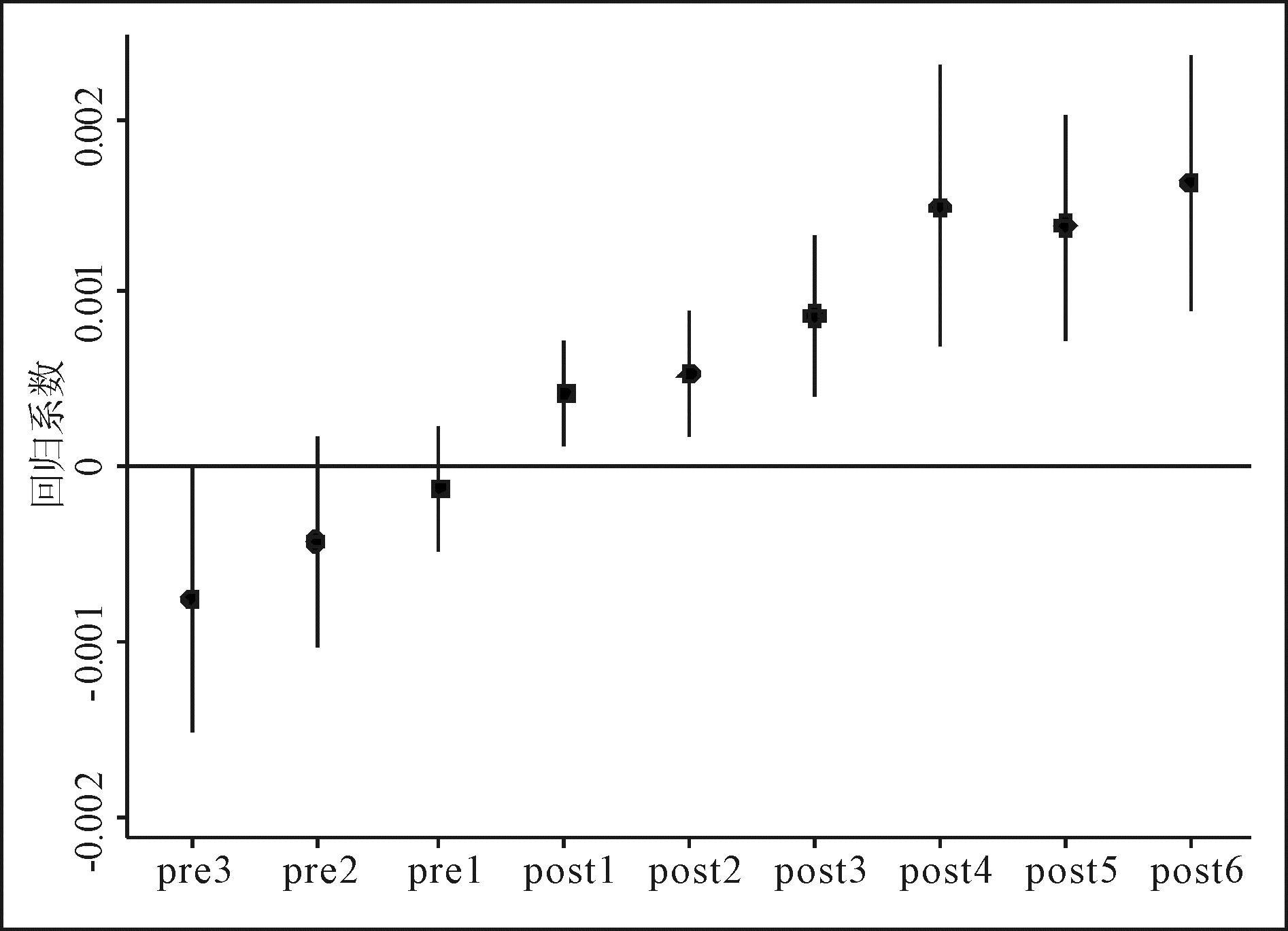 (1)平行趋势检验。双重差分估计结果的有效性需要满足平行趋势假设,实验组与对照组在政策实施前拥有相同的时间变化趋势。参照Beck等[31]的研究,采用事件分析法开展市场准入负面清单制度的动态效应研究: