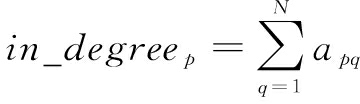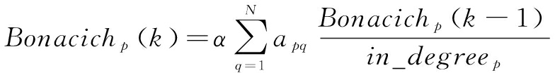 其中,Bonacichp(k)为专利p的中心度,α为每一次迭代的概率值。参考Page&Brin[21]的研究,将α设为0.85。apq=1表示专利q引用了专利p,否则为0;Bonacichp(k-1)为上一次迭代计算的中心度,