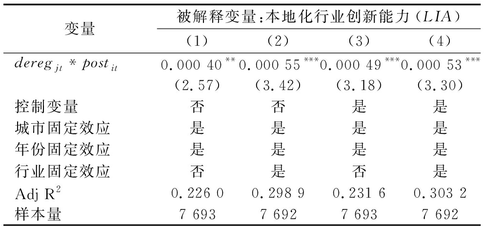 变量被解释变量:本地化行业创新能力(LIA)(1)(2)(3)(4)deregjt*postit0.000 40**0.000 55***0.000 49***0.000 53***(2.57)(3.42)(3.18)(3.30)控制变量否否是是城市固定效应是是是是年份固定效应是是是是行业固定效应否是否是Adj R20.226 00.298 90.231 60.303 2样本量7 6937 6927 6937 692