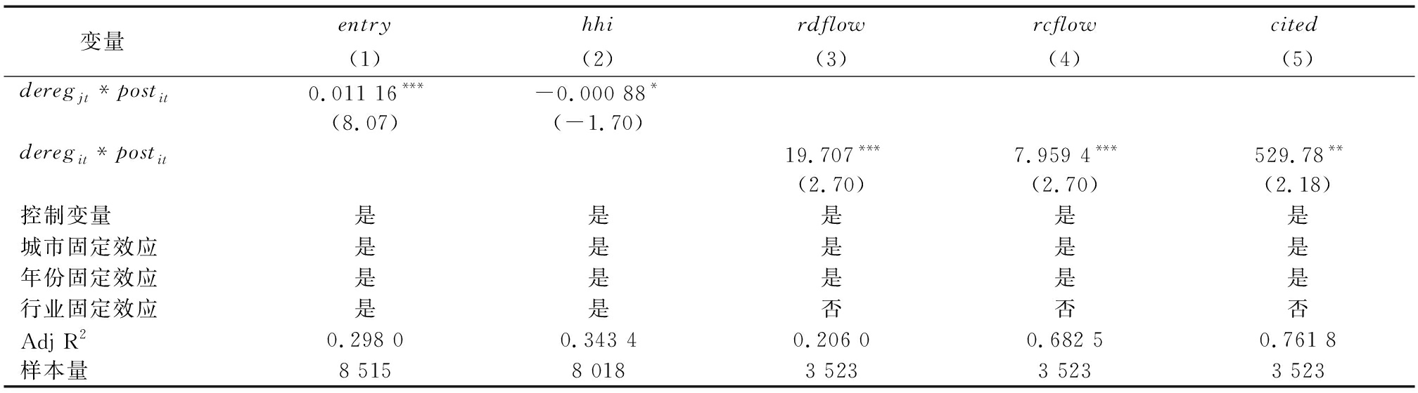 变量 entryhhirdflowrcflowcited(1)(2)(3)(4)(5)deregjt*postit0.011 16***-0.000 88*(8.07)(-1.70)deregit*postit19.707***7.959 4***529.78**(2.70)(2.70)(2.18)控制变量是是是是是城市固定效应是是是是是年份固定效应是是是是是行业固定效应是是否否否Adj R20.298 00.343 40.206 00.682 50.761 8样本量8 5158 0183 5233 5233 523