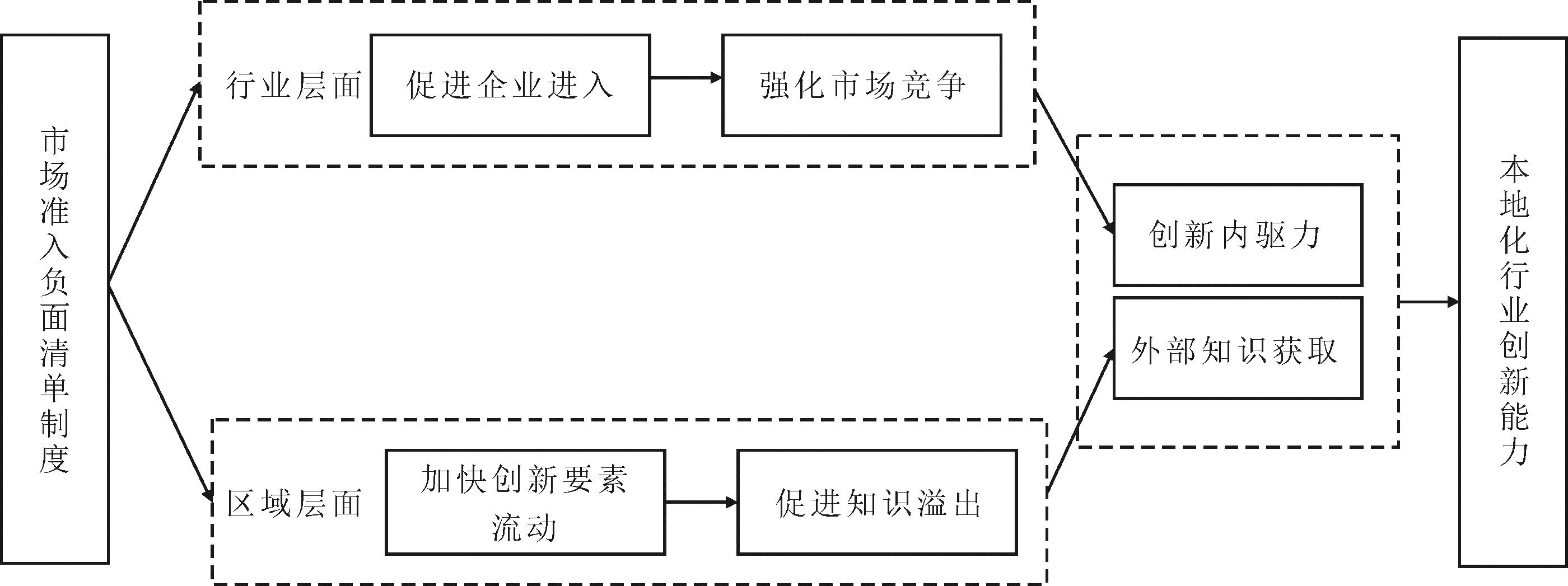 良好的制度环境是市场主体从事创新活动的必要支撑,是区域经济可持续发展的内在动力[22]。市场准入负面清单制度作为行业层面制定和调整,分区域、分时间逐步实行的重要市场经济改革举措,能够进一步激发企业竞争活力、促进统一大市场建立,从而为本地化创新营造良好的制度环境。因此,本文从行业及区域两个层面,阐明市场准入负面清单制度对本地化行业创新能力的影响,理论框架如图4所示。