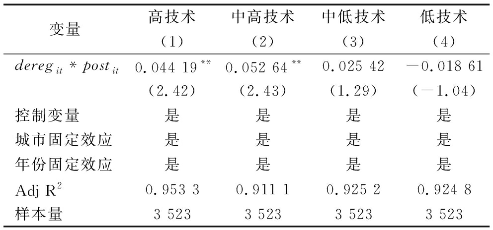 变量高技术中高技术中低技术低技术(1)(2)(3)(4)deregit*postit2.130 5**0.959 83*0.068 19-0.099 07(2.09)(1.76)(0.19)(-0.54)控制变量是是是是城市固定效应是是是是年份固定效应是是是是Adj R20.871 60.619 30.276 90.365 0样本量3 2843 2843 2843 284