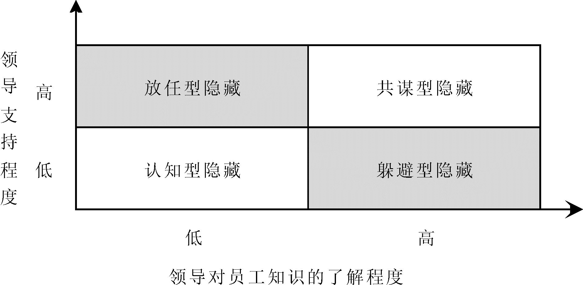 在界定知识隐藏概念时,本文遵循大多数学者做法,沿用Connelly等[11]的定义,认为知识隐藏是员工故意隐瞒或隐藏相关知识的行为。同时,在对知识隐藏进行分类时,本文借鉴Hartmann等[19]的分类框架,进一步考虑领导者与员工互动关系的影响,从领导支持程度(纵轴)和对员工知识了解程度(横轴)两个维度出发,提出4种知识隐藏类型,即共谋型隐藏、放任型隐藏、认知型隐藏、躲避型隐藏,如图1所示。