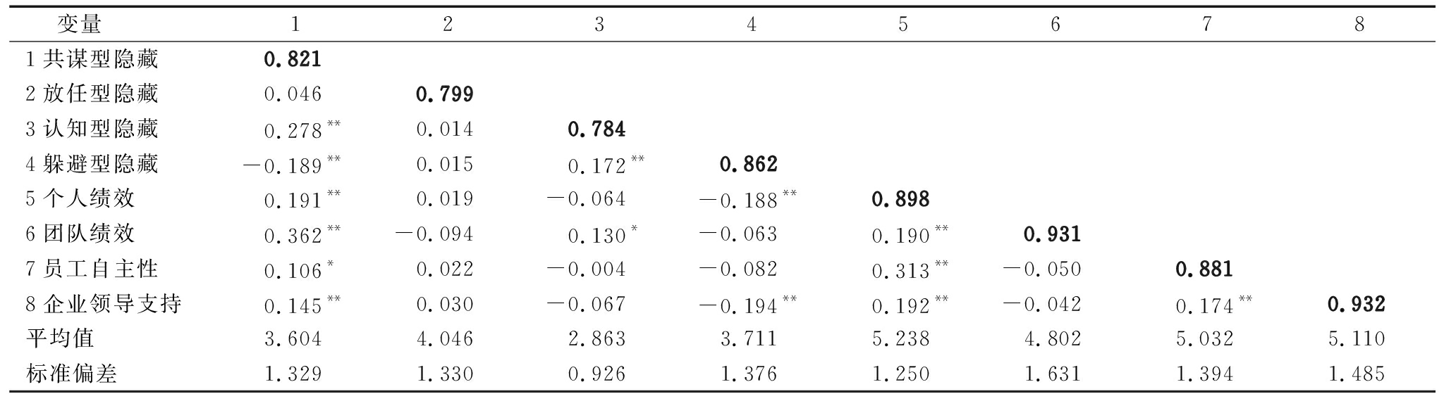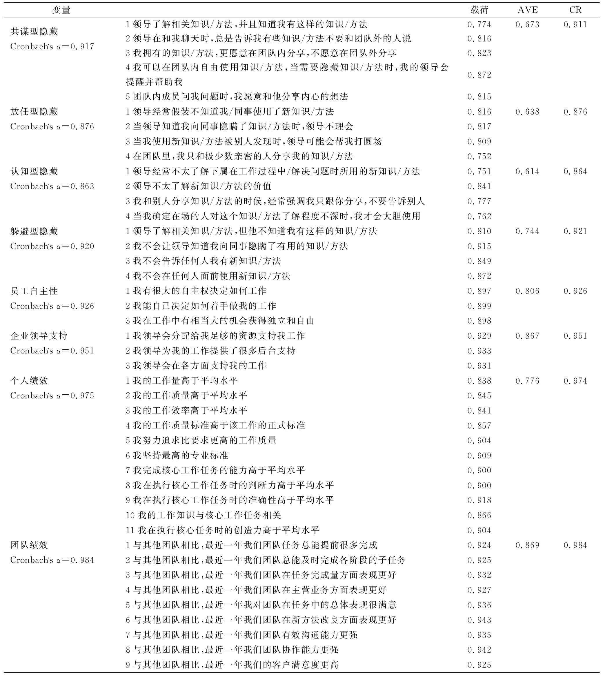 变量载荷AVECR共谋型隐藏Cronbach's α=0.9171领导了解相关知识/方法,并且知道我有这样的知识/方法0.7740.6730.9112领导在和我聊天时,总是告诉我有些知识/方法不要和团队外的人说0.8163我拥有的知识/方法,更愿意在团队内分享,不愿意在团队外分享0.8234我可以在团队内自由使用知识/方法,当需要隐藏知识/方法时,我的领导会提醒并帮助我0.8725团队内成员问我问题时,我愿意和他分享内心的想法0.815放任型隐藏Cronbach's α=0.8761领导经常假装不知道我/同事使用了新知识/方法0.8160.6380.8762当领导知道我向同事隐瞒了知识/方法时,领导不理会0.8173当我使用新知识/方法被别人发现时,领导可能会帮我打圆场0.8094在团队里,我只和极少数亲密的人分享我的知识/方法0.752认知型隐藏Cronbach's α=0.8631领导经常不太了解下属在工作过程中/解决问题时所用的新知识/方法0.7510.6140.8642领导不太了解新知识/方法的价值0.8413我和别人分享知识/方法的时候,经常强调我只跟你分享,不要告诉别人0.7774当我确定在场的人对这个知识/方法了解程度不深时,我才会大胆使用0.762躲避型隐藏Cronbach's α=0.9201领导了解相关知识/方法,但他不知道我有这样的知识/方法0.8100.7440.9212我不会让领导知道我向同事隐瞒了有用的知识/方法0.9153我不会告诉任何人我有新知识/方法0.8494我不会在任何人面前使用新知识/方法0.872员工自主性Cronbach's α=0.9261我有很大的自主权决定如何工作0.8970.8060.9262我能自己决定如何着手做我的工作0.8993我在工作中有相当大的机会获得独立和自由0.898企业领导支持Cronbach's α=0.9511我领导会分配给我足够的资源支持我工作0.9290.8670.9512我领导为我的工作提供了很多后台支持0.9333我领导会在各方面支持我的工作0.931个人绩效Cronbach's α=0.9751我的工作量高于平均水平0.8380.7760.9742我的工作质量高于平均水平0.8453我的工作效率高于平均水平0.8414我的工作质量标准高于该工作的正式标准0.8575我努力追求比要求更高的工作质量0.9046我坚持最高的专业标准0.9097我完成核心工作任务的能力高于平均水平0.9008我在执行核心工作任务时的判断力高于平均水平0.9009我在执行核心工作任务时的准确性高于平均水平0.91810我的工作知识与核心工作任务相关0.86611我在执行核心任务时的创造力高于平均水平0.904团队绩效Cronbach's α=0.9841与其他团队相比,最近一年我们团队任务总能提前很多完成0.9240.8690.9842与其他团队相比,最近一年我们团队总能及时完成各阶段的子任务0.9253与其他团队相比,最近一年我们团队在任务完成量方面表现更好0.9324与其他团队相比,最近一年我们团队在主营业务方面表现更好0.9275与其他团队相比,最近一年我对团队在任务中的总体表现很满意0.9366与其他团队相比,最近一年我们团队在新方法改良方面表现更好0.9437与其他团队相比,最近一年我们团队有效沟通能力更强0.9358与其他团队相比,最近一年我们团队协作能力更强0.9429与其他团队相比,最近一年我们的客户满意度更高0.925