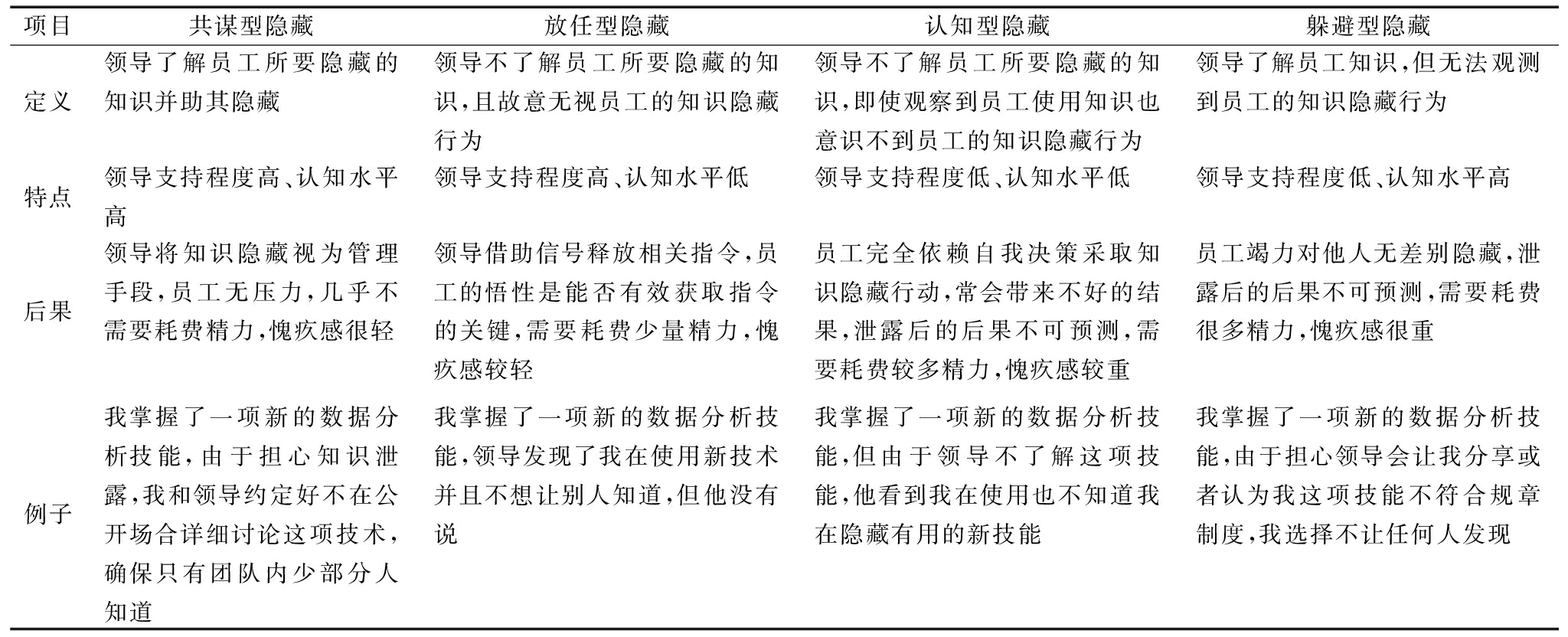 在图1中,放任型隐藏和躲避型隐藏展现了知识隐藏行为在不同领导参与程度下的对立情形(高&低,低&高)。放任型隐藏主要体现领导者既不关心员工知识隐藏行为也不关心员工拥有哪些值得传播的知识,对知识隐藏采取忽略或默许的态度。相对地,躲避型隐藏则体现员工因担心直接上司的不信任而选择隐藏知识。由于直接上司通常对员工知识和能力有较深了解,员工进行知识隐藏时躲避直接上司的动机会更强烈。共谋型隐藏和认知型隐藏属于两种极端且截然不同的情形(高&高,低&低)。共谋型隐藏体现领导者对员工知识较了解,并且基于组织内部知识分布与利用的策略性考虑,积极支持员工的知识隐藏行为。认知型隐藏则体现领导者不支持员工的知识隐藏行为,但由于对员工所掌握的知识缺乏了解,往往无法识别出知识隐藏行为。在上述情况下,知识隐藏涉及员工对个体知识的认知管理以及如何避免知识的外显化表达。表1总结了4类知识隐藏的具体属性。