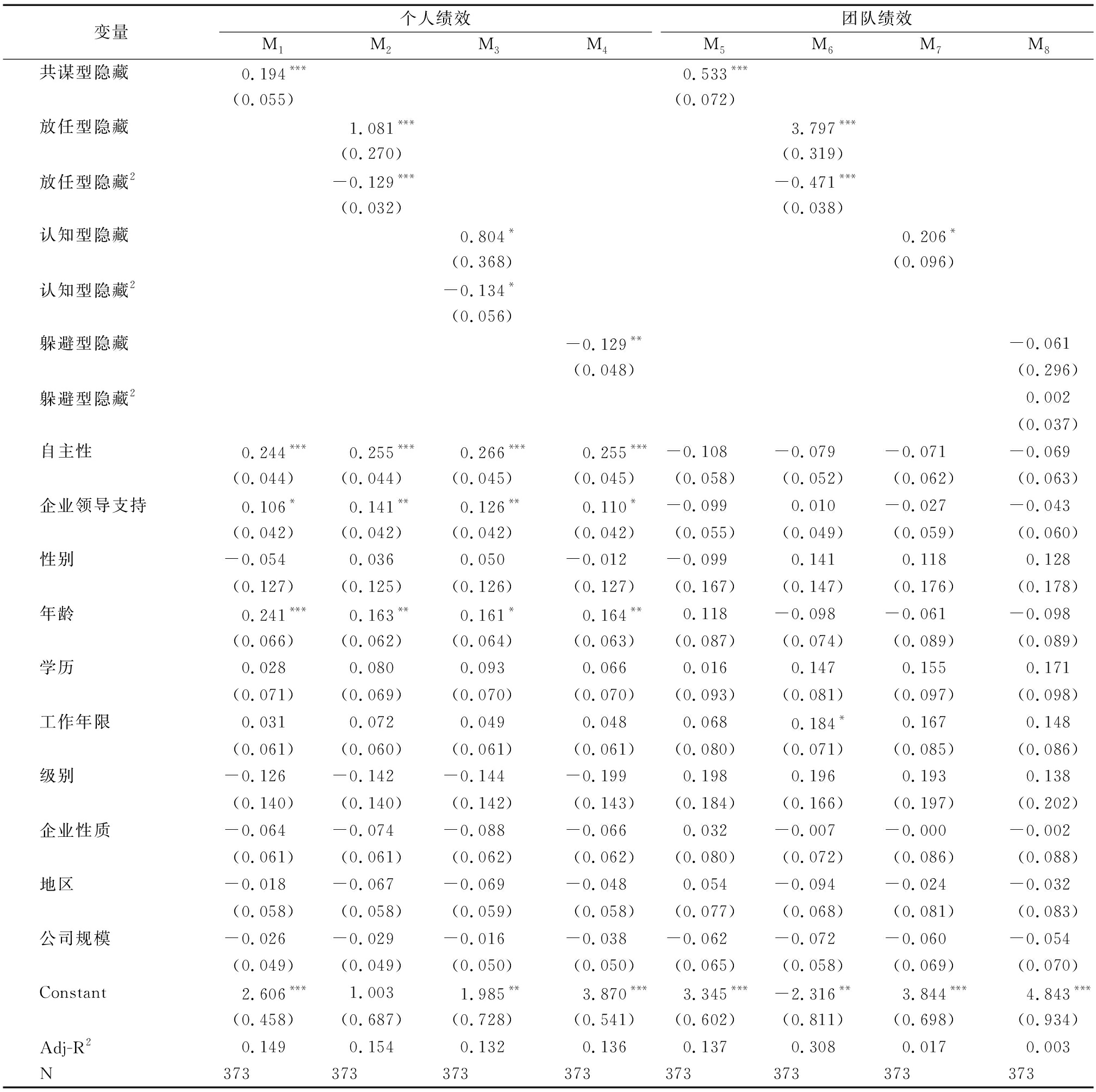表4为主要变量描述性统计和相关性分析结果。从分析结果看,共谋型隐藏、放任型隐藏、认知型隐藏和躲避型隐藏的均值分别为3.604、4.046、2.863与3.711,说明样本企业中放任型隐藏最常见,其次是躲避型隐藏。相关性分析结果表明,共谋型隐藏与个人绩效、团队绩效正相关,认知型隐藏与团队绩效正相关,但显著性水平略低,躲避型隐藏与个人绩效负相关,而放任型隐藏、认知型隐藏与个人绩效的相关性,以及放任型隐藏、躲避型隐藏与团队绩效的相关性均不显著,可以考虑为非线性关系或无关系,初步支持了本研究假设。此外,变量间的相关系数均小于0.7,且各变量的方差膨胀因子均小于临界值10,表明回归模型不存在严重的多重共线性问题。