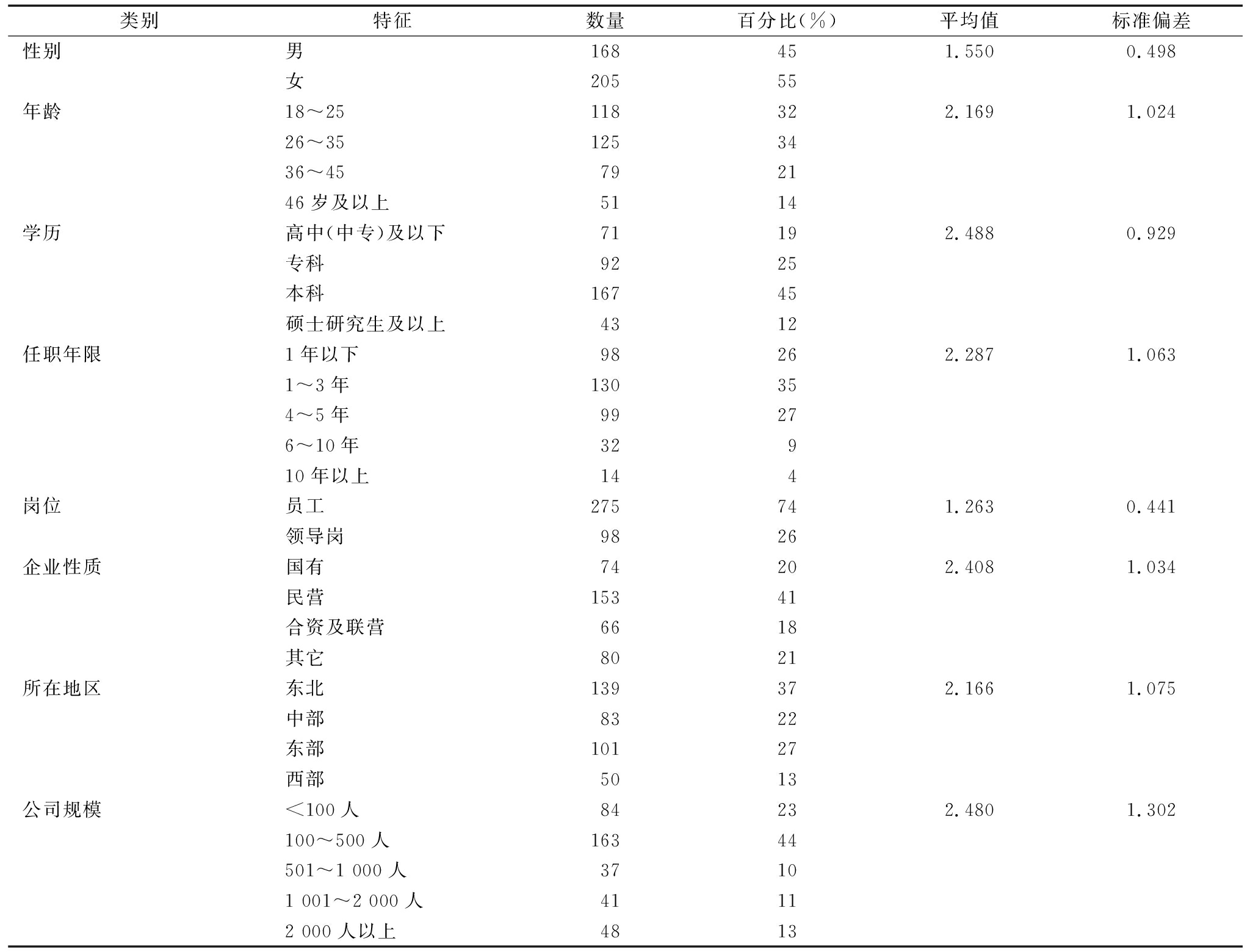 本研究通过对成熟的知识隐藏行为量表进行修订,探究不同知识隐藏类型对个人绩效与团队绩效的影响,调研时间为2023年7-11月。预调研阶段采用滚雪球方法,对天津、辽宁的3家企业中10个团队小规模发放问卷100份,回收问卷93份。通过对数据进行探索性和验证性因子分析,评估初始问卷信效度,在此基础上修正问卷题项和措辞,并确定最终调查问卷。在正式发放问卷阶段,研究样本主要来源于天津、陕西、浙江等多地多家企业,既包括经济发达地区,也包括经济较薄弱地区,具有一定广泛性。同时,考虑到团队氛围会影响知识隐藏类型、效果以及不同视角下对知识隐藏和绩效的感知不同,本文从不同企业中选取多个团队员工及领导者作为调研对象,旨在针对调研问题作出更科学和全面的判断。为了避免同源误差问题,正式问卷在3个时间段内收集数据,间隔为90天,共计发放问卷512份,剔除信息缺失严重、填答明显不认真的无效问卷后,最终得到有效问卷373份,有效回收率为72.9%。有效样本分布特征如表2所示。