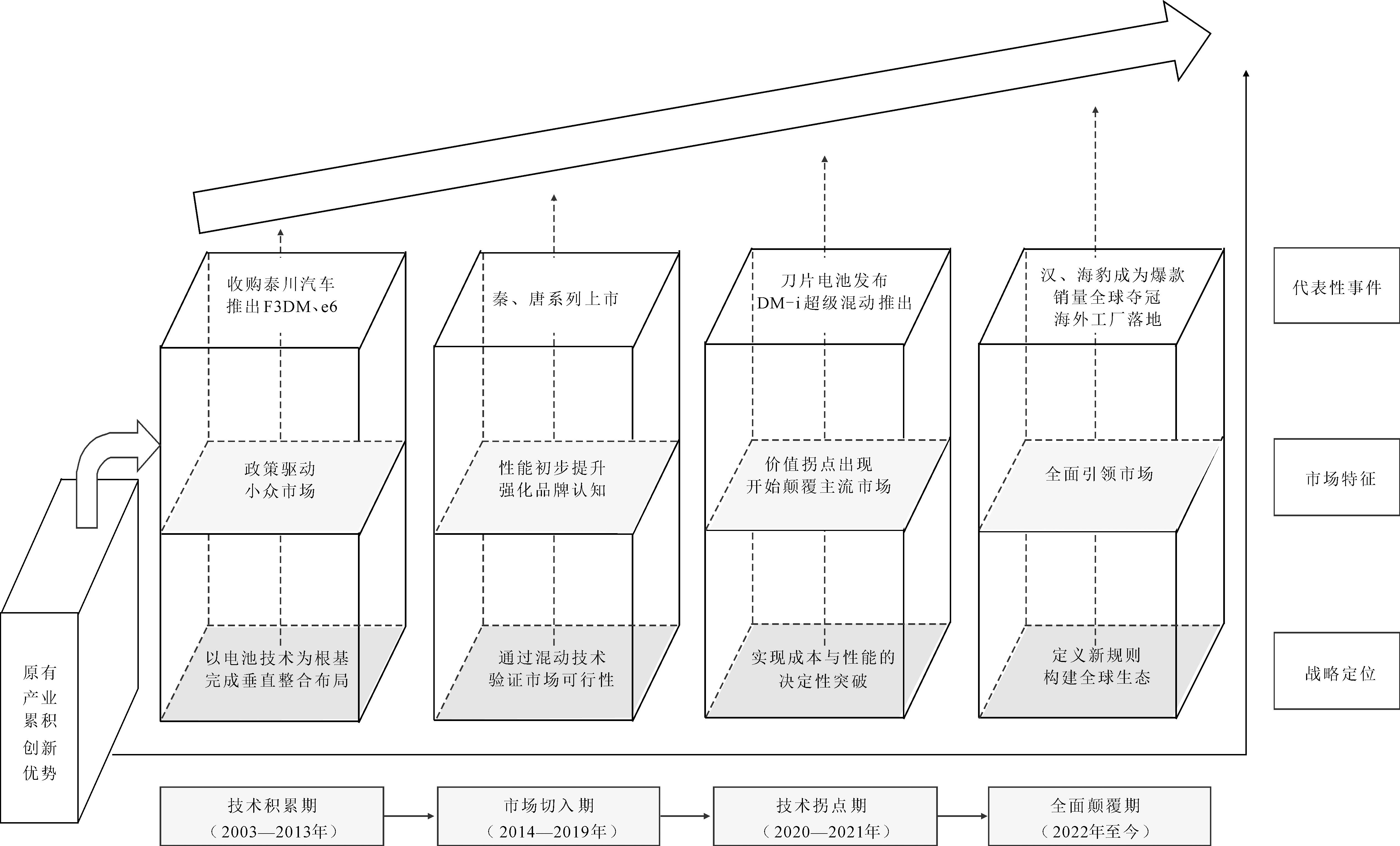 2000年以来,中国汽车市场长期呈现“外资主导、合资垄断”的格局,自主品牌主要集中于低端市场,依赖价格竞争,核心零部件对外依存度较高[39],而彼时新能源汽车尚处于技术探索阶段,电池能量密度低、续航里程短、成本高昂,尚未进入行业竞争核心视野。比亚迪的机会储备始于2003—2013年的技术积累期:依托原有产业的电池技术优势,通过收购秦川汽车获取资质、推出F3DM、e6车型布局成本控制,打入政策驱动的小众市场,为后续突破奠定基础,精准识别出在位者忽视的技术洼地。
