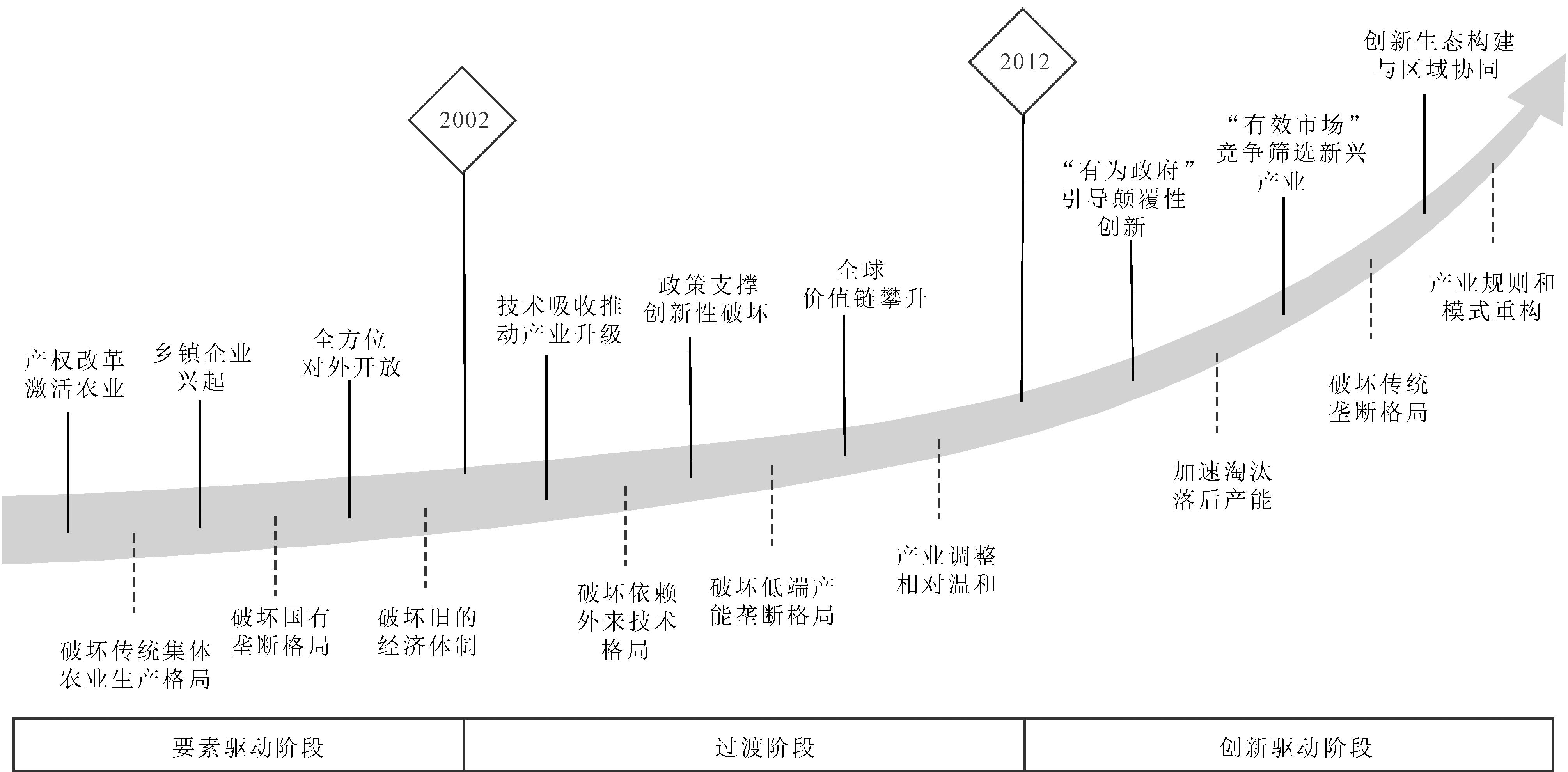 (3)在实践特征层面,通过增量创造主导的渐进式调整打破新旧动能转换冲突,构建平稳升级的转型路径。该阶段“创造性破坏”呈现“增量创造为主、存量调整为辅”的鲜明特征,对传统低效产能的“破坏性”淘汰相对温和,既避免了剧烈调整的社会成本,又通过产品生产与知识生产的良性互动,为后续原创性创新积累了技术、资本和人才要素,符合经济转型的实际需求。同时,体制内改革与体制外成长双轨格局持续演化,非国有经济快速发展推动国有经济改革,形成“创造性破坏”的多元动力源。