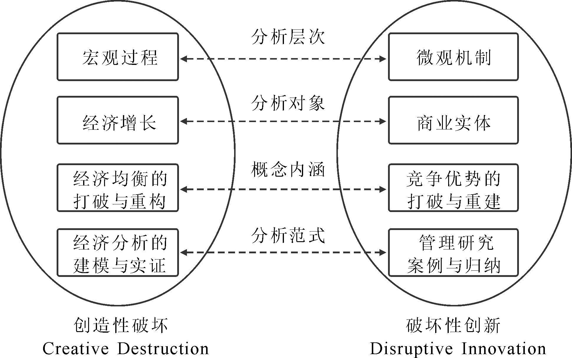 从分析层次看,“破坏性创新”是“创造性破坏”的微观过程与动力机制。后者作为一般性的规范阐释,重在描述宏观经济过程的非连续性与可持续增长。而“破坏性创新”则描述新进入者如何通过低端市场与新市场战略颠覆在位者并占据领先优势。在该微观过程中,旧的产业格局被打破,更高效率、更低成本或更有竞争力的“模式”得以确立。从分析对象看,“破坏性创新”关注居于不同市场地位、拥有不同能力禀赋的竞争“对手”,而非“创造性破坏”中被简化的同质性微观主体。具体而言,不同于“创造性破坏”关注宏观经济表现,“破坏性创新”讨论微观商业实体(如企业)如何在具体商业竞争中取代之前占据市场统治地位的主导性企业。从概念内涵看,“破坏性创新”讨论企业市场地位的打破与重塑,而非如“创造性破坏”那样分析经济均衡的打破与重构。换句话说,“破坏性创新”并不关注供给与需求变化,而是考虑商业竞争中竞争优势的建立与消散。从分析范式看,“破坏性创新”更多采用管理研究中的案例与归纳范式,少有“创造性破坏”分析中普遍采用的经济建模或实证方法。这使得“破坏性创新”研究在具备一定普适性的同时,一般具有较高的理论特殊性与实践启发性。综上,“破坏性创新”作为“创造性破坏”的微观过程,从市场竞争与产业变革角度回答了“创造性破坏”关于如何打破旧均衡与建立新均衡的机制缺乏问题。