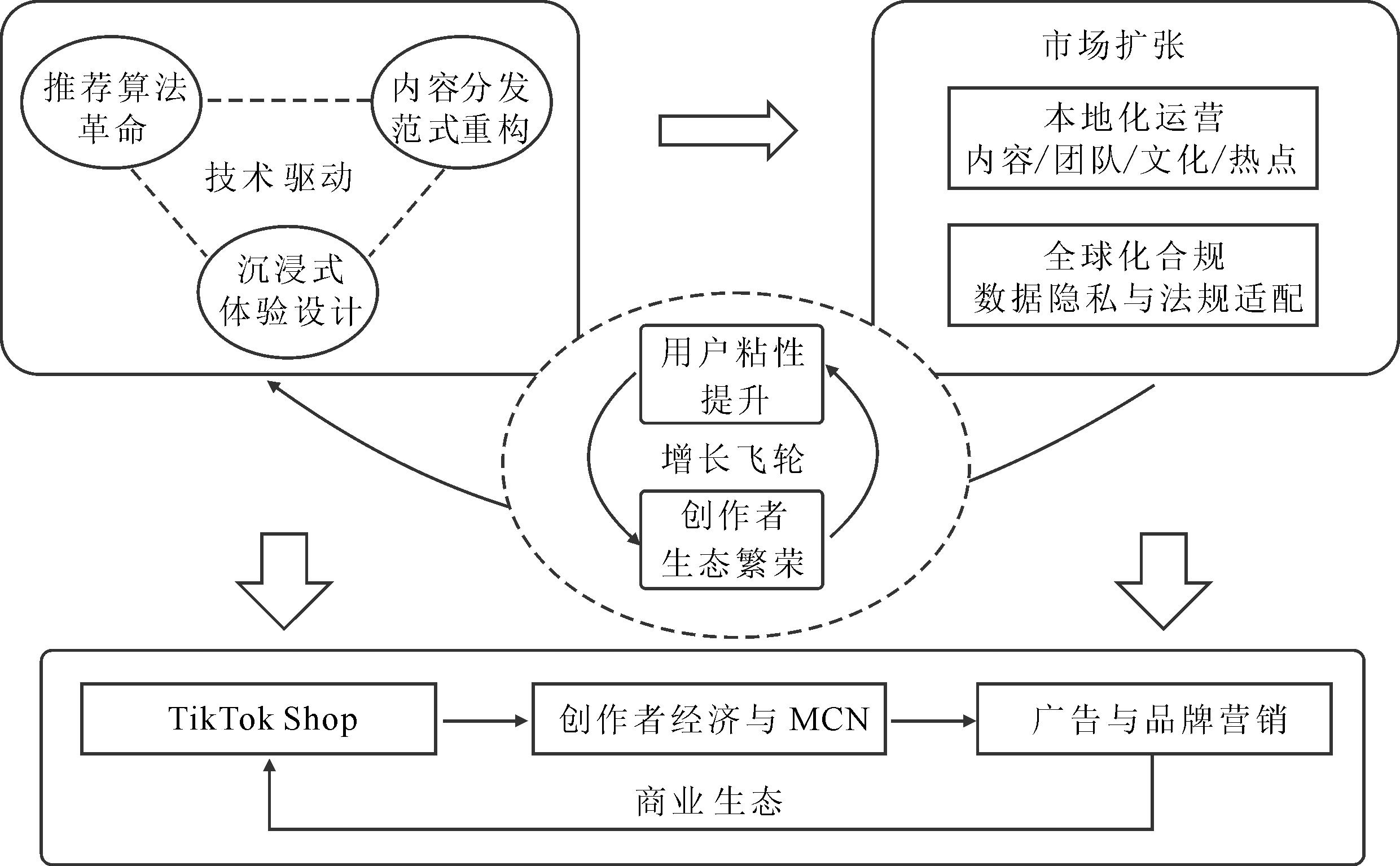 此前,Facebook、Instagram等海外社交平台内容以欧美成熟市场的图文、长视频为主,新兴市场的本地化内容供给不足,同时普通用户轻量化、高参与度的内容创作需求未被充分覆盖,这一“新市场空白”正是TikTok跨境数字生态全球化范式初始破局的方向。TikTok从技术驱动和市场扩张两个维度完成新市场开拓:在技术层面,将其核心算法推荐机制与全球用户泛娱乐需求相结合,精准匹配不同市场的内容偏好,降低用户内容获取成本,以兴趣为导向的内容分发模式,实现了从“人找内容”到“内容找人”的范式转变,使用户日均使用时长迅速超越传统社交平台。在市场层面,搭配算法框架,针对不同国家和地区的文化特点,组建本地内容团队,以简易创作工具激活和扶持本土创作者,快速积累新市场用户基础,同时适配不同市场监管要求,消除合规壁垒,保障新市场渗透的可持续性。TikTok Shop年度调研报告显示,截至2024年8月,TikTok全球月活跃用户数达15.8亿人,覆盖150多个国家和地区,成为全球下载量最高的短视频社交应用平台。