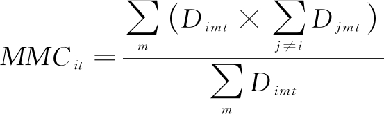 其中,MMCit表示i企业第t年平均多市场接触程度。Dimt或Djmt为二元指示变量,如果在t时间段i(j)企业在m市场中有子公司,则Dimt或Djmt为1,否则为0。∑Dimt表示i企业第t年所涉足的市场总数。MMC值越大,表示该企业在所有地理市场上与竞争对手平均接触次数越多,即多市场接触水平越高。