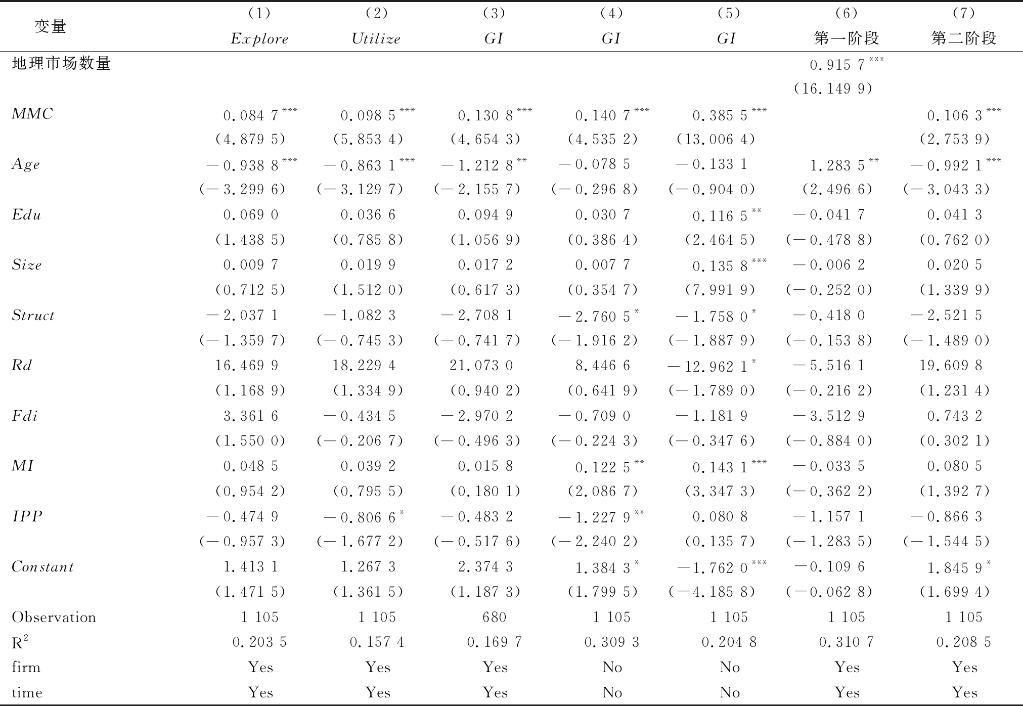 变量 (1) (2) (3)(4)(5)(6)(7) ExploreUtilize GI GI GI第一阶段第二阶段地理市场数量 0.915 7*** (16.149 9) MMC0.084 7***0.098 5***0.130 8***0.140 7***0.385 5***0.106 3*** (4.879 5)(5.853 4)(4.654 3)(4.535 2)(13.006 4)(2.753 9) Age-0.938 8***-0.863 1***-1.212 8**-0.078 5-0.133 11.283 5**-0.992 1*** (-3.299 6)(-3.129 7)(-2.155 7)(-0.296 8)(-0.904 0)(2.496 6)(-3.043 3) Edu0.069 00.036 60.094 90.030 70.116 5**-0.041 70.041 3 (1.438 5)(0.785 8)(1.056 9)(0.386 4)(2.464 5)(-0.478 8)(0.762 0) Size0.009 70.019 90.017 20.007 70.135 8***-0.006 20.020 5 (0.712 5)(1.512 0)(0.617 3)(0.354 7)(7.991 9)(-0.252 0)(1.339 9) Struct-2.037 1-1.082 3-2.708 1-2.760 5*-1.758 0*-0.418 0-2.521 5 (-1.359 7)(-0.745 3)(-0.741 7)(-1.916 2)(-1.887 9)(-0.153 8)(-1.489 0) Rd16.469 918.229 421.073 08.446 6-12.962 1*-5.516 119.609 8 (1.168 9)(1.334 9)(0.940 2)(0.641 9)(-1.789 0)(-0.216 2)(1.231 4) Fdi3.361 6-0.434 5-2.970 2-0.709 0-1.181 9-3.512 90.743 2 (1.550 0)(-0.206 7)(-0.496 3)(-0.224 3)(-0.347 6)(-0.884 0)(0.302 1) MI0.048 50.039 20.015 80.122 5**0.143 1***-0.033 50.080 5 (0.954 2)(0.795 5)(0.180 1)(2.086 7)(3.347 3)(-0.362 2)(1.392 7) IPP-0.474 9-0.806 6*-0.483 2-1.227 9**0.080 8-1.157 1-0.866 3 (-0.957 3)(-1.677 2)(-0.517 6)(-2.240 2)(0.135 7)(-1.283 5)(-1.544 5)Constant1.413 11.267 32.374 31.384 3*-1.762 0***-0.109 61.845 9* (1.471 5)(1.361 5)(1.187 3)(1.799 5)(-4.185 8)(-0.062 8)(1.699 4)Observation1 1051 1056801 1051 1051 1051 105R20.203 50.157 40.169 70.309 30.204 80.310 70.208 5 firmYes Yes Yes No NoYesYes timeYes Yes Yes No NoYesYes