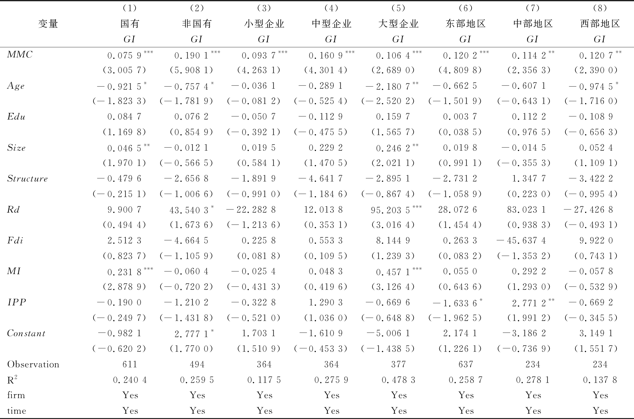 (1)(2)(3)(4)(5)(6)(7)(8)变量国有非国有小型企业中型企业大型企业东部地区中部地区西部地区GIGIGIGIGIGIGIGIMMC0.075 9***0.190 1***0.093 7***0.160 9***0.106 4***0.120 2***0.114 2**0.120 7**(3.005 7)(5.908 1)(4.263 1)(4.301 4)(2.689 0)(4.809 8)(2.356 3)(2.390 0)Age-0.921 5*-0.757 4*-0.036 1-0.289 1-2.180 7**-0.662 5-0.607 1-0.974 5*(-1.823 3)(-1.781 9)(-0.081 2)(-0.525 4)(-2.520 2)(-1.501 9)(-0.643 1)(-1.716 0)Edu0.084 70.076 2-0.050 7-0.112 90.159 70.003 70.112 2-0.108 9(1.169 8)(0.854 9)(-0.392 1)(-0.475 5)(1.565 7)(0.038 5)(0.976 5)(-0.656 3)Size0.046 5**-0.012 10.019 50.229 20.246 2**0.019 8-0.014 50.052 4(1.970 1)(-0.566 5)(0.584 1)(1.470 5)(2.021 1)(0.991 1)(-0.355 3)(1.109 1)Structure-0.479 6-2.656 8-1.891 9-4.641 7-2.895 1-2.731 21.347 7-3.422 2(-0.215 1)(-1.006 6)(-0.991 0)(-1.184 6)(-0.867 4)(-1.058 9)(0.223 0)(-0.995 4)Rd9.900 743.540 3*-22.282 812.013 895.203 5***28.072 683.023 1-27.426 8(0.494 4)(1.673 6)(-1.213 6)(0.353 1)(3.016 4)(1.454 4)(0.938 3)(-0.493 1)Fdi2.512 3-4.664 50.225 80.553 38.144 90.263 3-45.637 49.922 0(0.823 7)(-1.105 9)(0.081 8)(0.109 5)(1.239 3)(0.083 2)(-1.353 2)(0.743 1)MI0.231 8***-0.060 4-0.025 40.048 30.457 1***0.055 00.292 2-0.057 8(2.878 9)(-0.720 2)(-0.431 3)(0.419 6)(3.126 4)(0.643 6)(1.293 0)(-0.532 9)IPP-0.190 0-1.210 2-0.322 81.290 3-0.669 6-1.633 6*2.771 2**-0.669 2(-0.249 7)(-1.431 8)(-0.521 0)(1.036 0)(-0.648 8)(-1.962 5)(1.991 2)(-0.345 5)Constant-0.982 12.777 1*1.703 1-1.610 9-5.006 12.174 1-3.186 23.149 1(-0.620 2)(1.770 0)(1.510 9)(-0.453 3)(-1.438 5)(1.226 1)(-0.736 9)(1.551 7)Observation611494364364377637234234R20.240 40.259 50.117 50.275 90.478 30.258 70.278 10.137 8firmYes YesYesYesYesYesYesYestimeYesYesYesYesYesYesYesYes