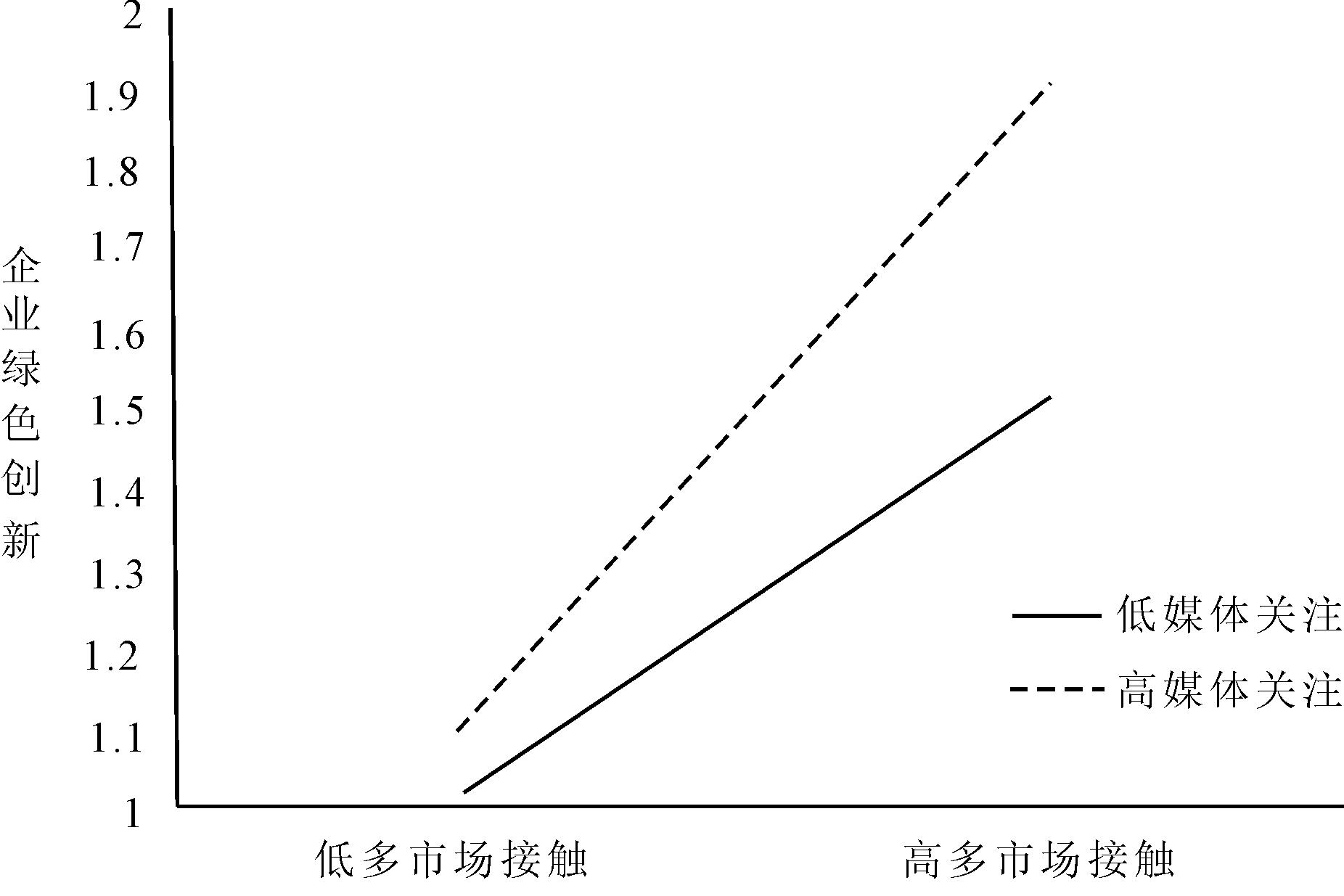 随着媒体对绿色发展、环境保护的宣传,大众社会环保意识不断增强,对企业生产排放造成的污染问题日益关注。媒体通过披露企业在环境保护、环境污染、绿色创新等方面的信息,引导公众对企业的关注和评价,进而对企业绿色创新决策产生影响。张玉明等[25]研究发现,媒体关注度(负面报道)能够显著提高企业绿色创新绩效;赵莉等[26]研究发现,媒体关注度对企业绿色创新具有正向影响。在多市场接触情景下,作为社会监督力量,媒体关注能够强化多市场接触与企业绿色创新的关系。