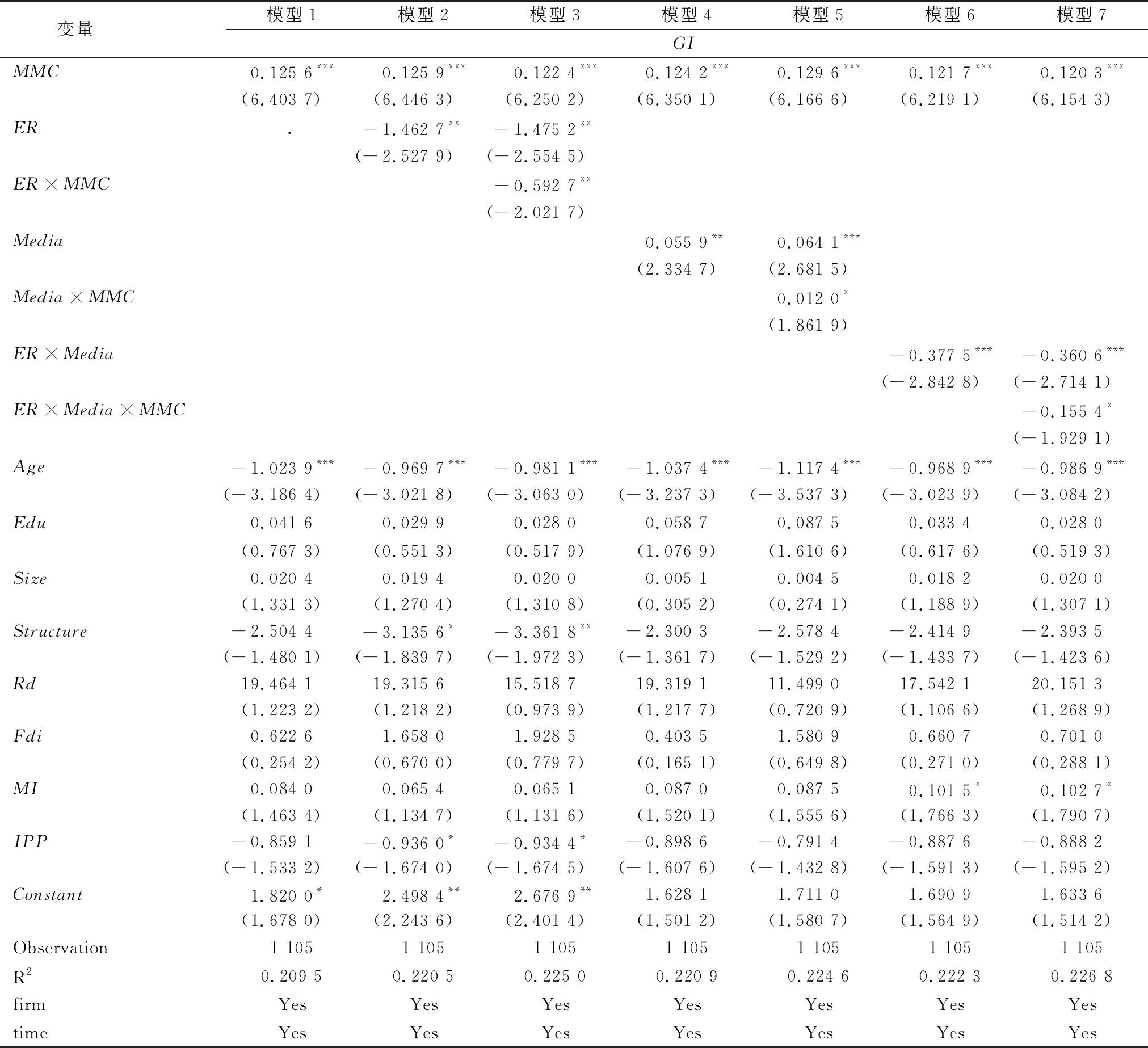 变量模型1模型2模型3模型4模型5模型6模型7GIMMC0.125 6***0.125 9***0.122 4***0.124 2***0.129 6***0.121 7***0.120 3***(6.403 7)(6.446 3)(6.250 2)(6.350 1)(6.166 6)(6.219 1)(6.154 3)ER.-1.462 7**-1.475 2**(-2.527 9)(-2.554 5)ER×MMC-0.592 7**(-2.021 7)Media0.055 9**0.064 1***(2.334 7)(2.681 5)Media×MMC0.012 0*(1.861 9)ER×Media-0.377 5***-0.360 6***(-2.842 8)(-2.714 1)ER×Media×MMC-0.155 4*(-1.929 1)Age-1.023 9***-0.969 7***-0.981 1***-1.037 4***-1.117 4***-0.968 9***-0.986 9***(-3.186 4)(-3.021 8)(-3.063 0)(-3.237 3)(-3.537 3)(-3.023 9)(-3.084 2)Edu0.041 60.029 90.028 00.058 70.087 50.033 40.028 0(0.767 3)(0.551 3)(0.517 9)(1.076 9)(1.610 6)(0.617 6)(0.519 3)Size0.020 40.019 40.020 00.005 10.004 50.018 20.020 0(1.331 3)(1.270 4)(1.310 8)(0.305 2)(0.274 1)(1.188 9)(1.307 1)Structure-2.504 4-3.135 6*-3.361 8**-2.300 3-2.578 4-2.414 9-2.393 5(-1.480 1)(-1.839 7)(-1.972 3)(-1.361 7)(-1.529 2)(-1.433 7)(-1.423 6)Rd19.464 119.315 615.518 719.319 111.499 017.542 120.151 3(1.223 2)(1.218 2)(0.973 9)(1.217 7)(0.720 9)(1.106 6)(1.268 9)Fdi0.622 61.658 01.928 50.403 51.580 90.660 70.701 0(0.254 2)(0.670 0)(0.779 7)(0.165 1)(0.649 8)(0.271 0)(0.288 1)MI0.084 00.065 40.065 10.087 00.087 50.101 5*0.102 7*(1.463 4)(1.134 7)(1.131 6)(1.520 1)(1.555 6)(1.766 3)(1.790 7)IPP-0.859 1-0.936 0*-0.934 4*-0.898 6-0.791 4-0.887 6-0.888 2(-1.533 2)(-1.674 0)(-1.674 5)(-1.607 6)(-1.432 8)(-1.591 3)(-1.595 2)Constant1.820 0*2.498 4**2.676 9**1.628 11.711 01.690 91.633 6(1.678 0)(2.243 6)(2.401 4)(1.501 2)(1.580 7)(1.564 9)(1.514 2)Observation1 1051 1051 1051 1051 1051 1051 105R20.209 50.220 50.225 00.220 90.224 60.222 30.226 8firmYesYesYesYesYesYesYestimeYesYesYesYesYesYesYes