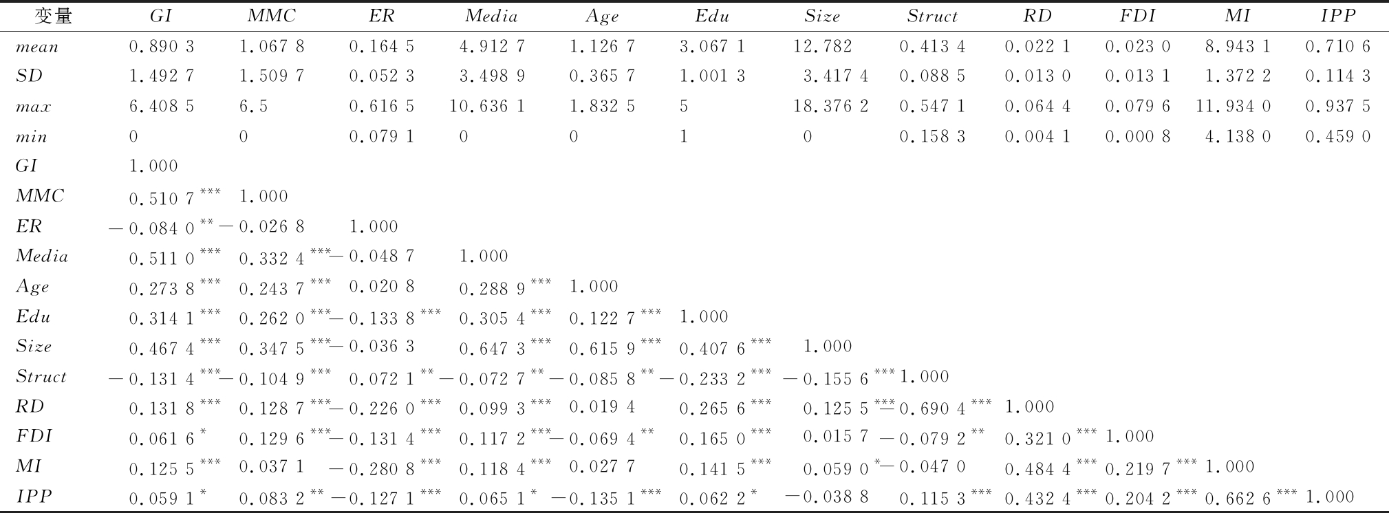 变量GIMMCERMediaAgeEduSizeStructRDFDIMIIPPmean0.890 31.067 80.164 54.912 71.126 73.067 112.7820.413 40.022 10.023 08.943 10.710 6SD1.492 71.509 70.052 33.498 90.365 71.001 33.417 40.088 50.013 00.013 11.372 20.114 3max6.408 56.50.616 510.636 11.832 5518.376 20.547 10.064 40.079 611.934 00.937 5min000.079 100100.158 30.004 10.000 84.138 00.459 0GI1.000 MMC0.510 7***1.000 ER-0.084 0**-0.026 81.000Media0.511 0***0.332 4***-0.048 71.000Age0.273 8***0.243 7***0.020 80.288 9***1.000Edu0.314 1***0.262 0***-0.133 8***0.305 4***0.122 7***1.000Size0.467 4***0.347 5***-0.036 30.647 3***0.615 9***0.407 6***1.000Struct-0.131 4***-0.104 9***0.072 1**-0.072 7**-0.085 8**-0.233 2***-0.155 6***1.000RD0.131 8***0.128 7***-0.226 0***0.099 3***0.019 40.265 6***0.125 5***-0.690 4***1.000FDI0.061 6*0.129 6***-0.131 4***0.117 2***-0.069 4**0.165 0***0.015 7-0.079 2**0.321 0***1.000MI0.125 5***0.037 1-0.280 8***0.118 4***0.027 70.141 5***0.059 0*-0.047 00.484 4***0.219 7***1.000IPP0.059 1*0.083 2**-0.127 1***0.065 1*-0.135 1***0.062 2*-0.038 80.115 3***0.432 4***0.204 2***0.662 6***1.000