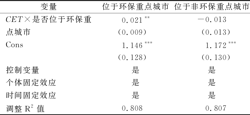 变量位于环保重点城市位于非环保重点城市CET×是否位于环保重点城市0.021**-0.013(0.009)(0.013)Cons1.146***1.172***(0.128)(0.130)控制变量是是个体固定效应是是时间固定效应是是调整R2值0.8080.807