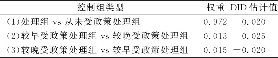 控制组类型权重DID估计值(1)处理组 vs 从未受政策处理组0.9720.020(2)较早受政策处理组 vs 较晚受政策处理组0.0130.025(3)较晚受政策处理组 vs 较早受政策处理组0.015-0.020