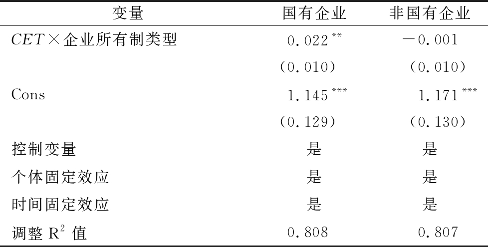 变量国有企业非国有企业CET×企业所有制类型0.022**-0.001(0.010)(0.010)Cons1.145***1.171***(0.129)(0.130)控制变量是是个体固定效应是是时间固定效应是是调整R2值0.8080.807