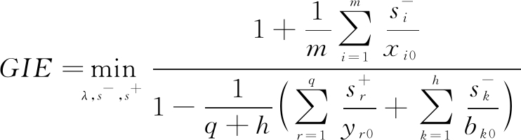 式中,GIE为企业绿色创新效率;xi、yr、bk分别为决策单元的投入、期望产出、非期望产出;i、r、k分别为投入、期望产出、非期望产出的要素个数;