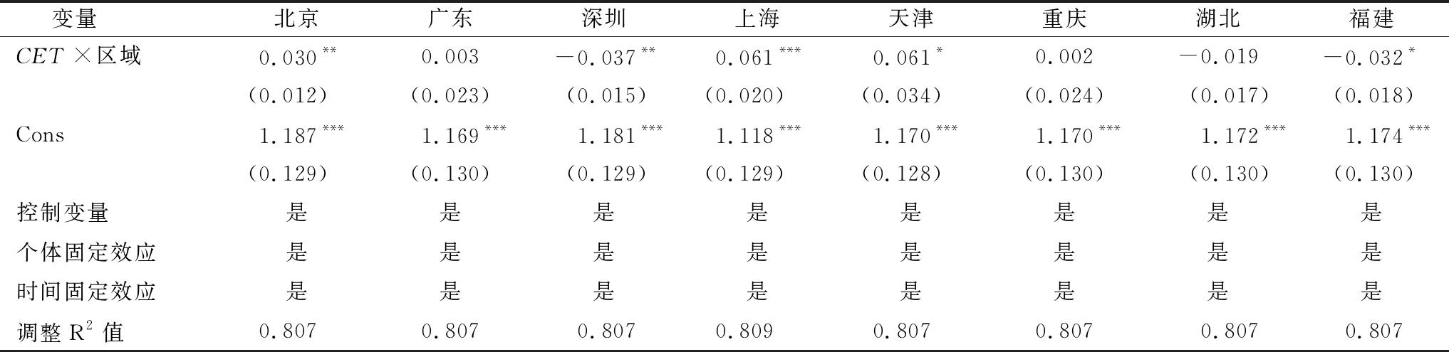 变量 北京广东深圳上海天津重庆湖北福建CET×区域0.030**0.003-0.037**0.061***0.061*0.002-0.019-0.032*(0.012)(0.023)(0.015)(0.020)(0.034)(0.024)(0.017)(0.018)Cons1.187***1.169***1.181***1.118***1.170***1.170***1.172***1.174***(0.129)(0.130)(0.129)(0.129)(0.128)(0.130)(0.130)(0.130)控制变量是是是是是是是是个体固定效应是是是是是是是是时间固定效应是是是是是是是是调整R2值0.8070.8070.8070.8090.8070.8070.8070.807