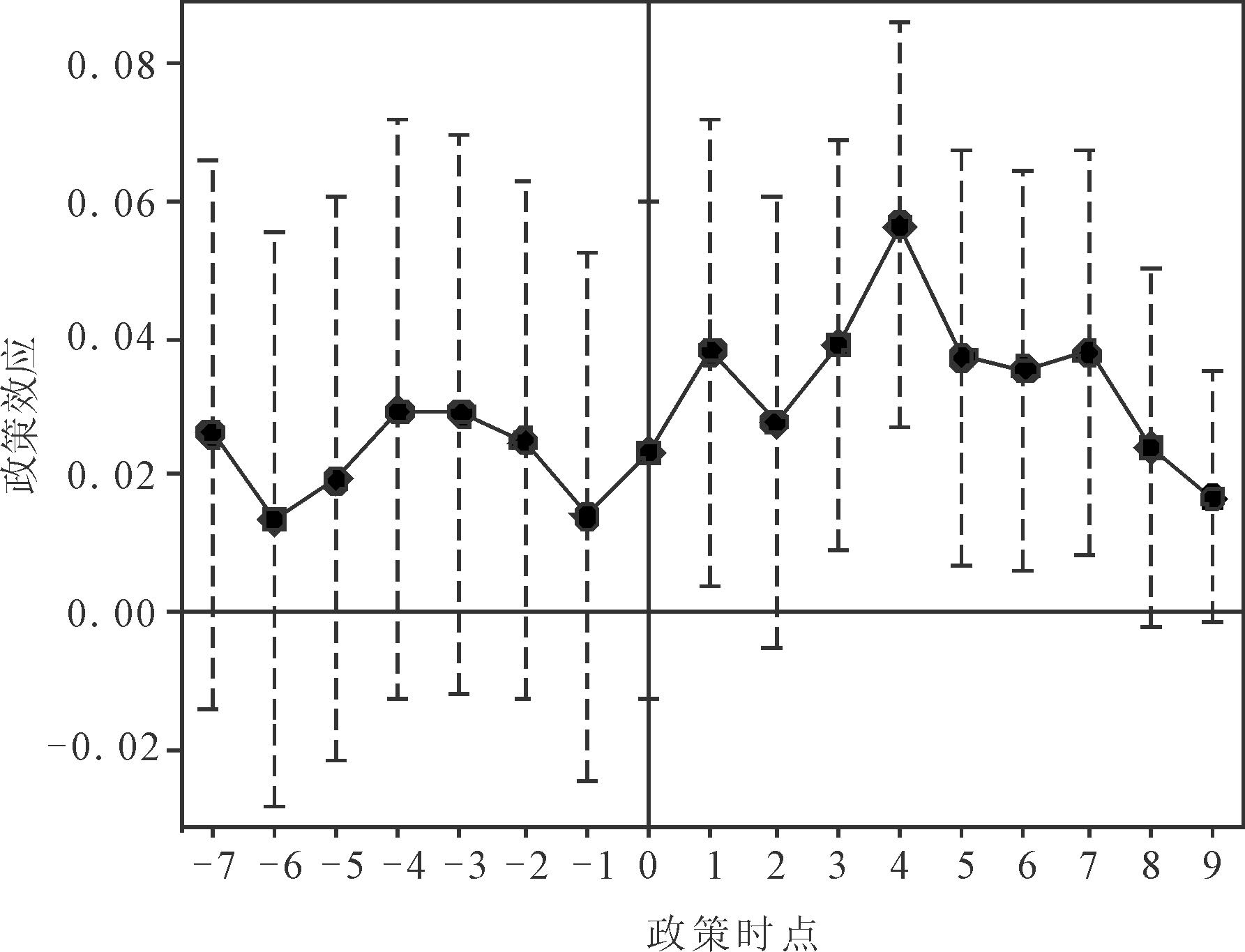 图2展示了平行趋势检验结果。由图2可知,在碳排放权交易实施前,置信区间均包含0,即未通过显著性检验且数值较小。这说明在实施试点政策前,企业绿色创新效率未呈现出显著差异,符合平行趋势前提假设。