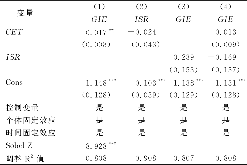 变量(1)(2)(3)(4)GIEISRGIEGIECET0.017**-0.0240.013(0.008)(0.043)(0.009)ISR0.239-0.169(0.153)(0.157)Cons1.148***0.103***1.138***1.131***(0.128)(0.039)(0.129)(0.128)控制变量是是是是个体固定效应是是是是时间固定效应是是是是Sobel Z-8.928***调整R2值0.8080.9080.8070.808