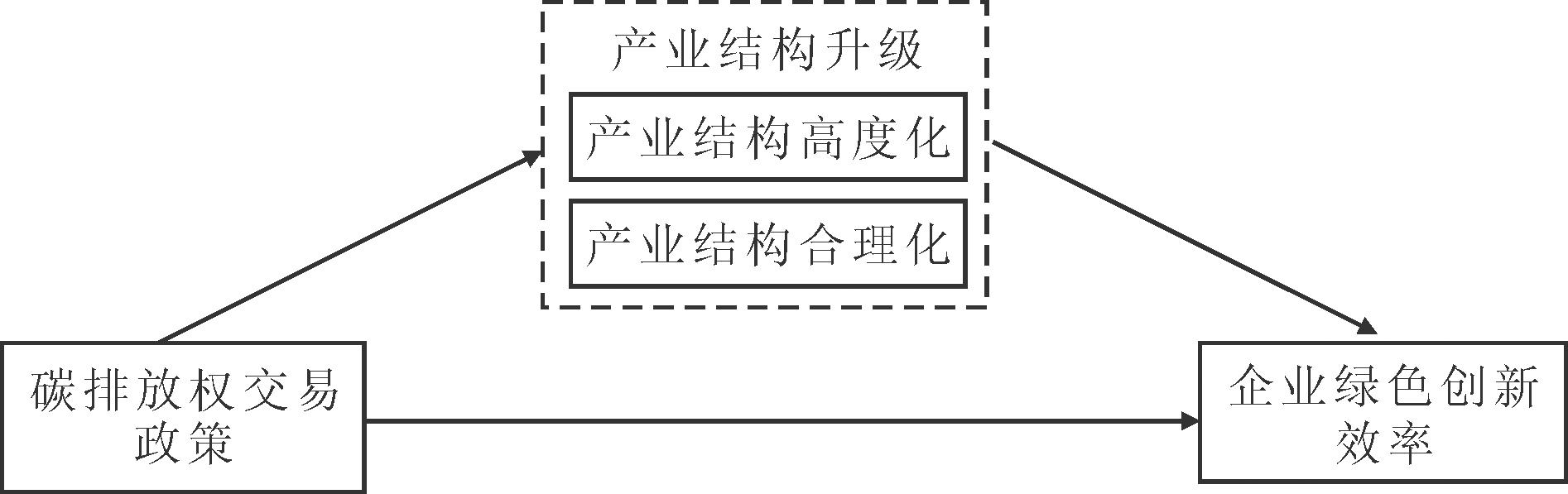 “波特假说”认为,环境规制能够激发企业绿色创新行为原因如下:①从根本上看,污染是一种经济浪费的表现,规制能让企业意识到现有资源效率低下问题与技术改进方向,并引导企业关注潜在领域。②政策明确降低了投资不确定性,拓宽了绿色低碳领域的融资渠道。③竞争是企业创新的主要驱动力,环境监管产生的外部压力加剧了产业中绿色竞争,能有效打破企业创新惰性。④环境监管为处于绿色转型过渡期的产业营造了公平竞争环境,即当以绿色低碳为导向时,有悖可持续发展理念的技术无法在市场中获取有利地位。随着环保合规、资源利用率提高与生产成本降低,企业核心竞争力得到提升[2]。综上,本文基于“波特假说”对碳排放权交易、产业结构转型与企业绿色创新效率的关系进行理论分析。