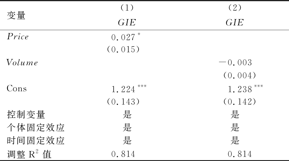变量(1)(2)GIEGIEPrice0.027*(0.015)Volume-0.003(0.004)Cons1.224***1.238***(0.143)(0.142)控制变量是是个体固定效应是是时间固定效应是是调整R2值0.8140.814