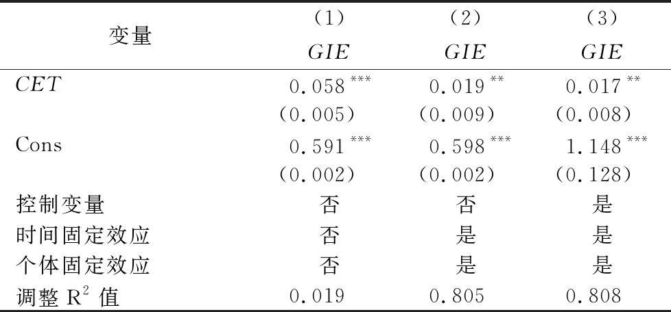 变量(1)(2)(3)GIEGIEGIECET0.058***0.019**0.017**(0.005)(0.009)(0.008)Cons0.591***0.598***1.148***(0.002)(0.002)(0.128)控制变量否否是时间固定效应否是是个体固定效应否是是调整R2值0.0190.8050.808