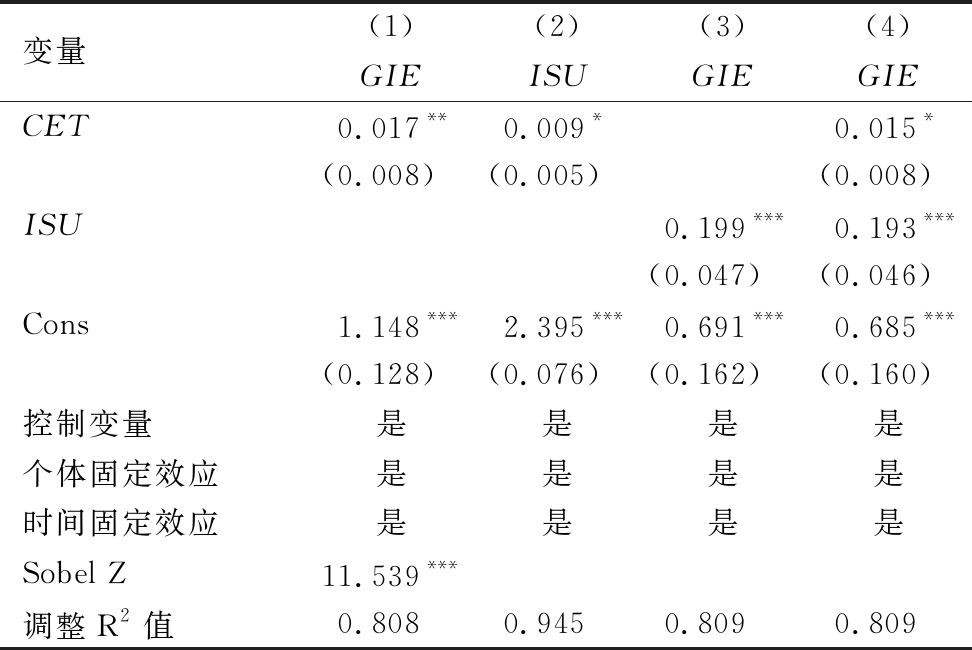 变量(1)(2)(3)(4)GIEISUGIEGIECET0.017**0.009*0.015*(0.008)(0.005)(0.008)ISU0.199***0.193***(0.047)(0.046)Cons1.148***2.395***0.691***0.685***(0.128)(0.076)(0.162)(0.160)控制变量是是是是个体固定效应是是是是时间固定效应是是是是Sobel Z11.539***调整R2值0.8080.9450.8090.809