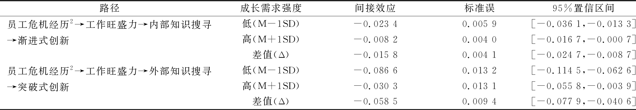 路径成长需求强度间接效应标准误95%置信区间员工危机经历2→工作旺盛力→内部知识搜寻→渐进式创新低(M-1SD)-0.023 40.005 9[-0.036 1,-0.013 3] 高(M+1SD)-0.008 20.004 0[-0.016 7,-0.000 7] 差值(Δ)-0.015 80.004 1[-0.024 7,-0.008 7]员工危机经历2→工作旺盛力→外部知识搜寻→突破式创新低(M-1SD)-0.086 60.013 2[-0.114 5,-0.062 6] 高(M+1SD)-0.030 30.013 1[-0.055 8,-0.003 9] 差值(Δ)-0.058 50.009 4[-0.077 9,-0.040 6]