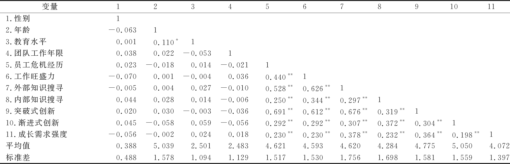 变量 1 2 3 4 5 6 7 8 9 10111.性别 1 2.年龄-0.063 1 3.教育水平0.0010.110* 1 4.团队工作年限0.0380.022-0.053 1 5.员工危机经历0.023-0.0180.014-0.021 1 6.工作旺盛力-0.0700.001-0.0040.0360.440** 1 7.外部知识搜寻-0.0050.0040.027-0.0100.528**0.626** 1 8.内部知识搜寻0.0440.0280.014-0.0060.250**0.344**0.297** 1 9.突破式创新0.0200.030-0.003-0.0360.691**0.612**0.676**0.319** 1 10.渐进式创新0.045-0.0580.059-0.0560.292**0.292**0.307**0.372**0.304** 1 11.成长需求强度-0.056-0.0020.0240.0180.230**0.230**0.378**0.232**0.364**0.198** 1平均值0.3885.0392.5012.4834.6214.5934.6204.2844.7755.0504.072标准差0.4881.5781.0941.1291.5171.5301.7561.6981.5811.5591.397