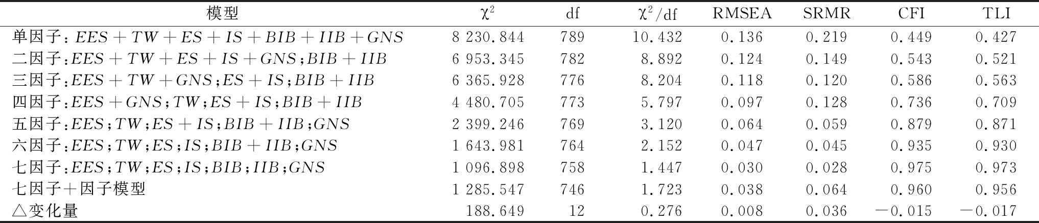 模型χ2dfχ2/dfRMSEASRMRCFITLI单因子:EES+TW+ES+IS+BIB+IIB+GNS8 230.84478910.4320.1360.2190.4490.427二因子:EES+TW+ES+IS+GNS;BIB+IIB6 953.3457828.8920.1240.1490.5430.521三因子:EES+TW+GNS;ES+IS;BIB+IIB6 365.9287768.2040.1180.1200.5860.563四因子:EES+GNS;TW;ES+IS;BIB+IIB4 480.7057735.7970.0970.1280.7360.709五因子:EES;TW;ES+IS;BIB+IIB;GNS2 399.2467693.1200.0640.0590.8790.871六因子:EES;TW;ES;IS;BIB+IIB;GNS1 643.9817642.1520.0470.0450.9350.930七因子:EES;TW;ES;IS;BIB;IIB;GNS1 096.8987581.4470.0300.0280.9750.973七因子+因子模型1 285.5477461.7230.0380.0640.9600.956△变化量188.649120.2760.0080.036-0.015-0.017