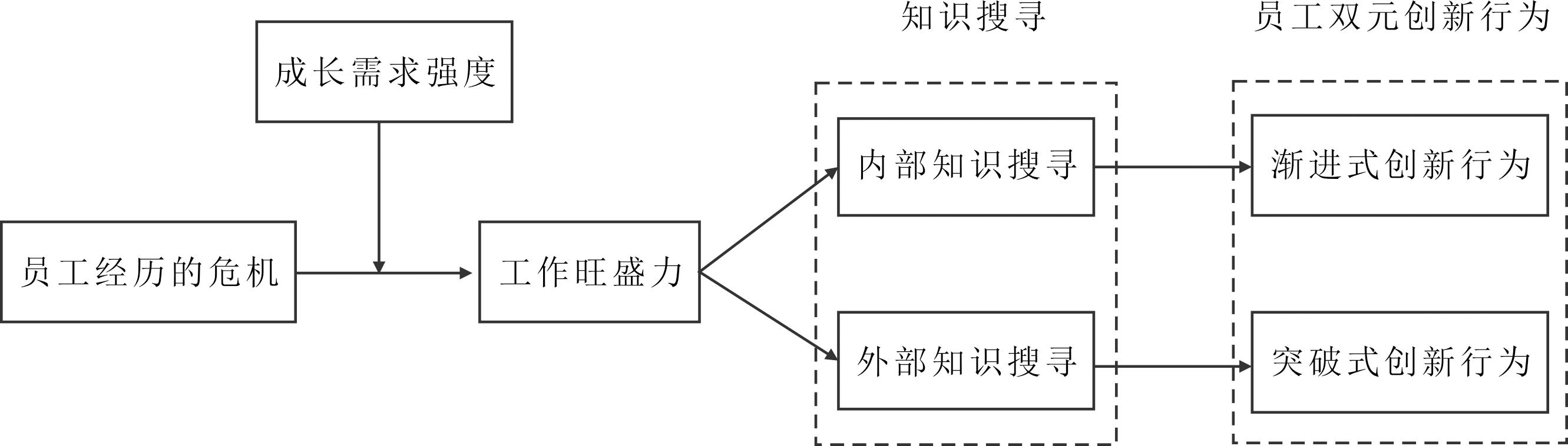 员工双元创新是指员工在个体层面的创新活动[4],根据创新理念的新颖性[5],将其划分为探索全新知识资源以进行风险性创新的突破式创新和对现有流程逐步改进与优化的渐进式创新[6],二者对不确定情境下维持组织竞争优势和实现长期发展均至关重要[7]。危机经历作为情境因素中的一种潜在威胁,是指员工在完成工作任务时遭遇危机事件并受到其影响[1],危机经历水平对应不同程度的工作要求[1]。工作要求-资源模型(JD-R)指出,当工作资源满足工作要求时会减少工作倦怠,但难以提高工作投入;当工作资源不满足工作要求时,员工会调用现有资源以获取更多额外资源并实现资源增益(胡恩华等,2023);当工作要求过高且缺少工作资源补充时,会损耗员工精力,产生消极结果[8]。据此可知,不同员工危机经历水平对应不同工作要求,而工作资源与工作要求的不同配置会影响员工工作旺盛力,进而对员工内外部知识搜寻产生不同影响。知识基础观指出,知识信息是员工进行创新活动的重要先决条件[9],不同类型创新活动需要不同的知识基础。因此,通过内部知识搜寻获取同质且实用的信息有助于员工进行对比和重构,弥补现有工作流程缺陷,推动渐进式创新[10]。但内部思维定势会限制思维突破,不利于突破式创新[11]。外部知识搜寻提供的异质性、跳脱性知识信息,为突破式创新提供了知识基础[10]。此外,人格特质理论认为,个体心理和行为会受到稳定特质的影响[12]。因此,员工可能因不同的成长需求和学习渴望而在相同危机经历水平下产生不同工作旺盛力[13],进而影响员工内外部知识搜寻和双元创新。